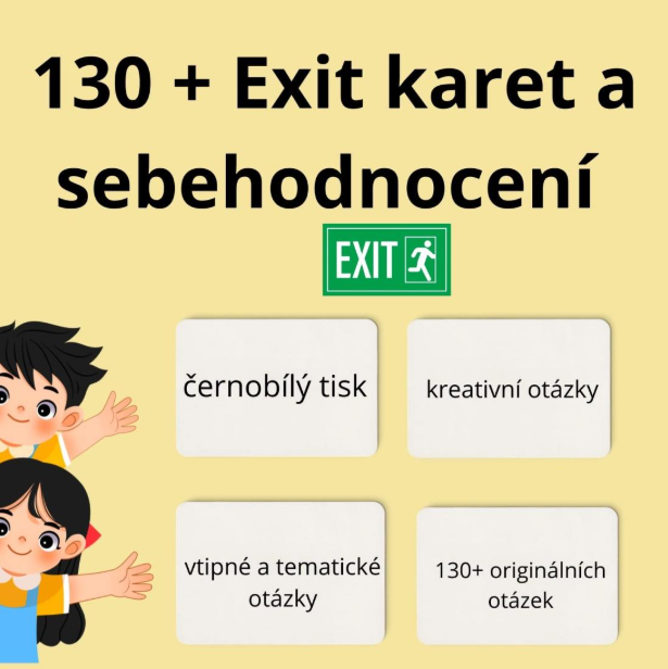 Hledáte způsob, jak efektivně a rychle ukončit vyučovací hodinu? Exit ticketky (exitky) jsou ideálním nástrojem pro okamžitou zpětnou vazbu, ověření porozumění i rozvoj sebereflexe žáků. Tato sada vám poskytne obrovskou zásobu inspirace, díky které už nikdy nebudete muset narychlo vymýšlet závěrečnou otázku.