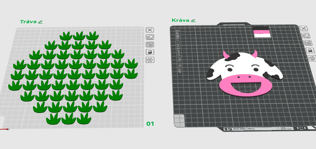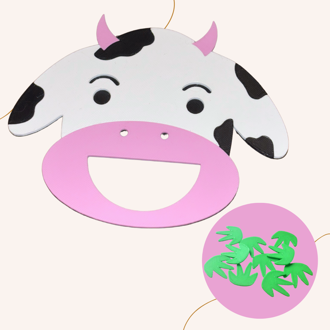 Originální 3D model Mlsouna – krávy s otvorem v puse, která se krmí pomocí trávy (součástí souboru). 🐄🌿