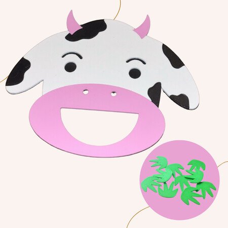 Součástí sady je tácek ve tvaru krávy a tráva, kterou lze dětem nabídnout k „krmení“ zvířátka.