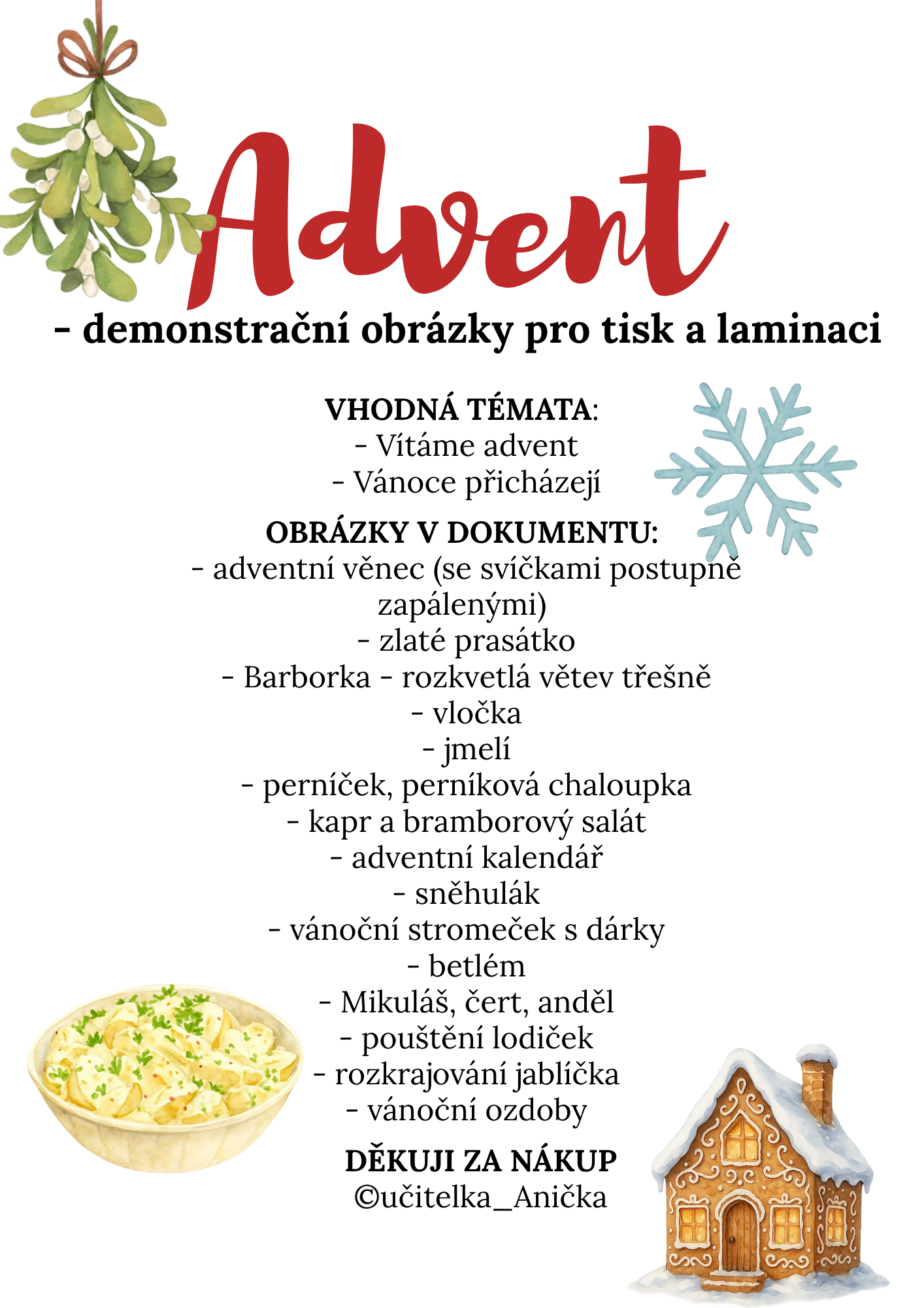 Obrázky s adventní tématikou na tisk a laminaci. Skvělé pro seznámení dětí tradicemi adventu a jeho charakteristickými znaky. Barevné, realistický ale zároveň dětské oko lákající vzhled. Lze vystřihnout po okrajích pro realistické tvary, pro mě osobně příjemnější než kartičky.