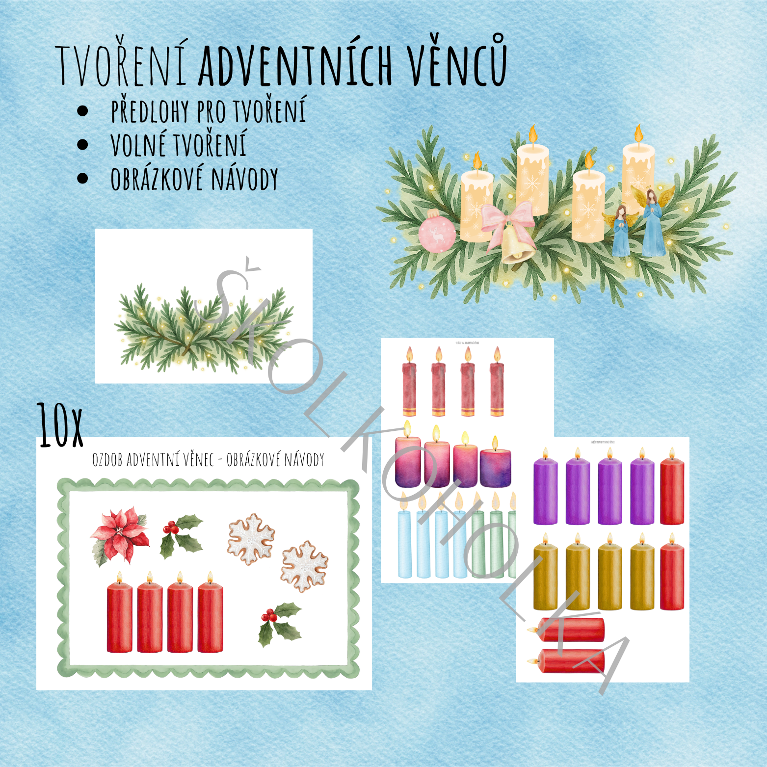 - Materiál: Přiloženy jsou svíčky, mašle, ozdoby a andělé, které děti mohou vystřihovat a přesně umisťovat.