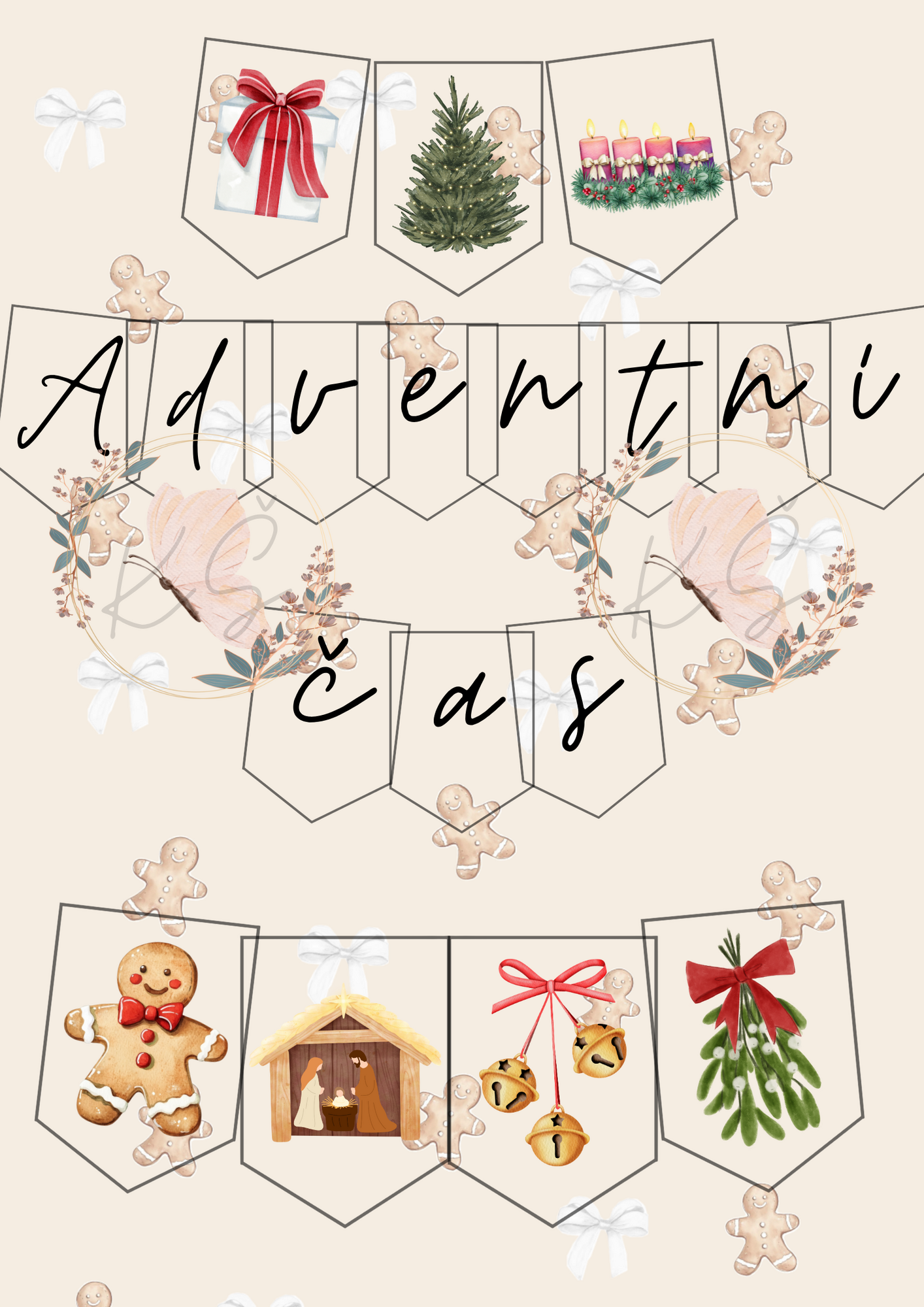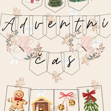 Soubor obsahuje 11 karet tvořící girlandu s nápisem "Adventní čas" a 15 karet tvořící girlandu s obrázky vztahujících se k tématu Advent a Vánoce