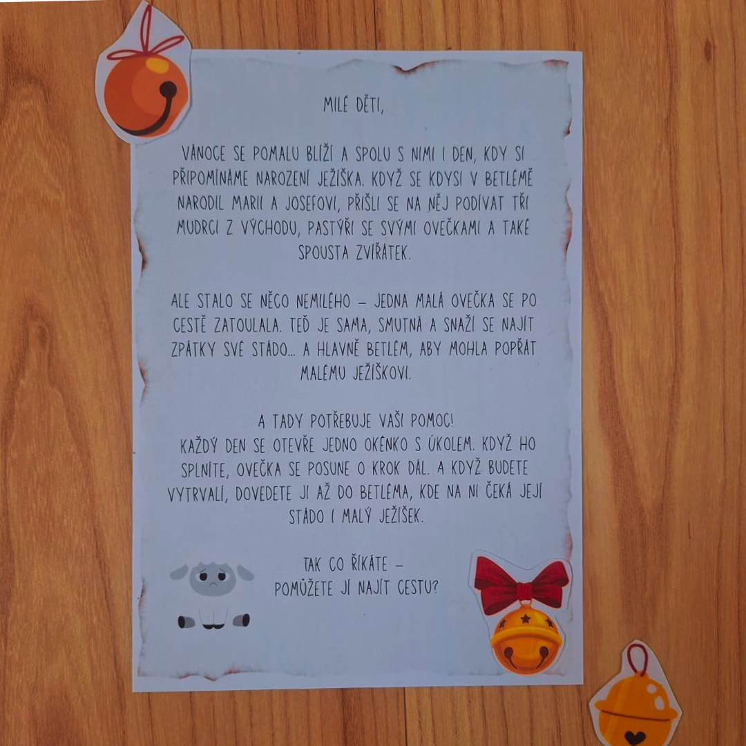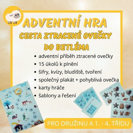 Tento adventní materiál má za cíl zpestřit dětem čekání na Vánoce. Postaven je na příběhu ztracené ovečky, která hledá cestu do Betléma. Úkoly jsou jednoduché, většinou založené na luštění a přemýšlení + trocha tvoření i nějaké to vánoční zpívání. Každý splněný úkol pak posune ovečku o krok blíž k cíli.