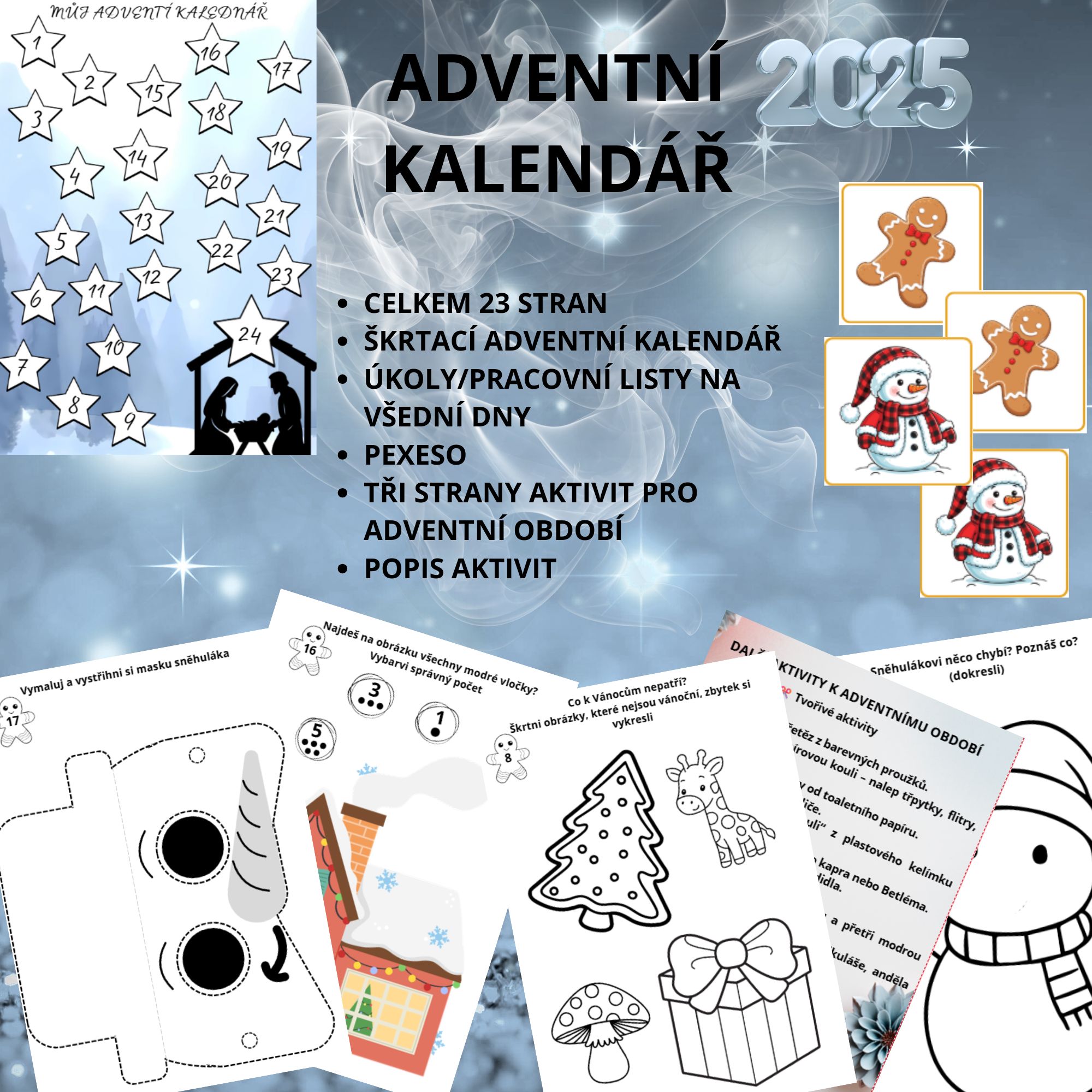 Adventní kalendář je určen pro mateřské školy, speciální školy nebo školní družiny. Děti si mohu každý den škrtnout uplynulý den a odpočítávat tak, kolik dní zbývá do Štědrého dne. Obsahuje pracovní listy s úkoly na všední dny, dále pexeso a tři stránky dalších aktivit (výtvarných, hudebních, dramatických) na adventní období.