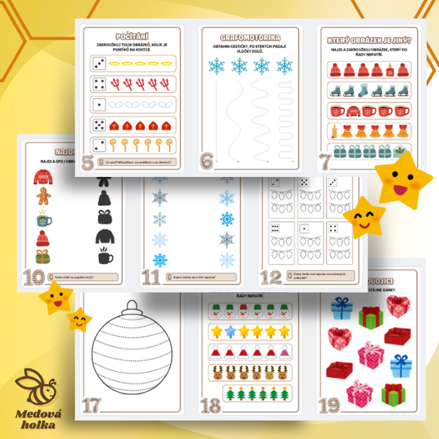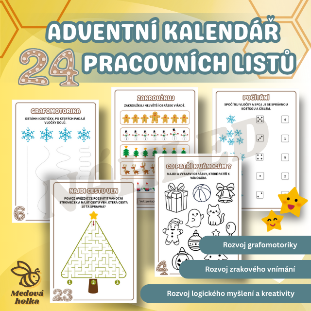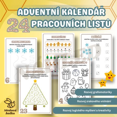 Materiál obsahuje 24 různorodých pracovních listů, které rozvíjejí širokou škálu dovedností od grafomotoriky, přes logické myšlení, až po zrakové vnímání. Poslední list na Štědrý den je záměrně odlehčený a spíše tematický, aby byl skutečně sváteční.