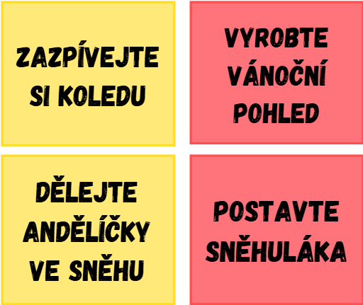 Kartičky s 20 úkoly, které si lze vytisknout, zalaminovat a každý prosincový den vybírat jednu aktivitu.
