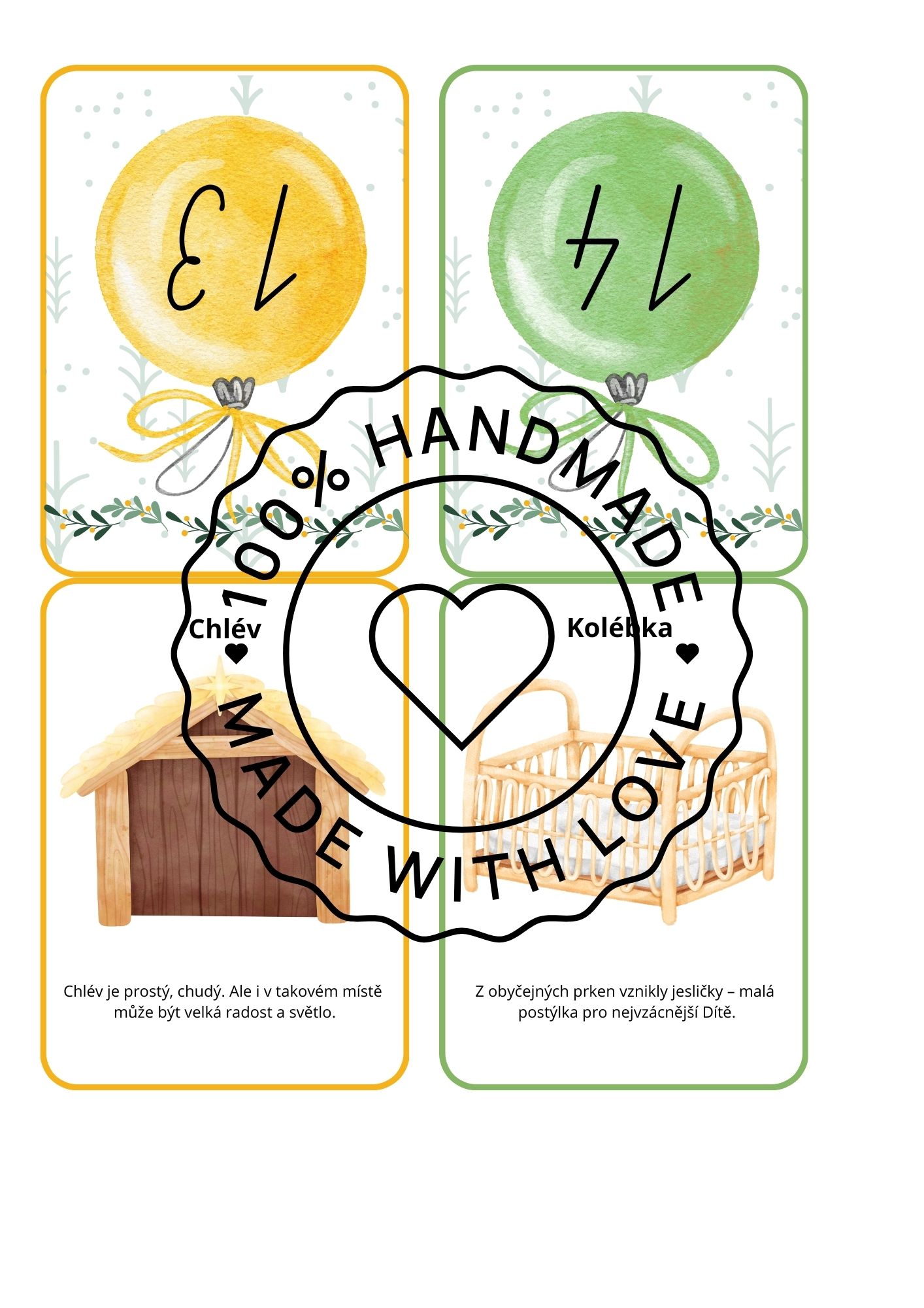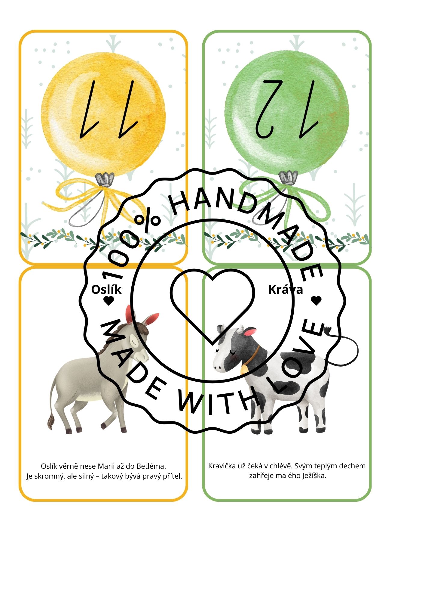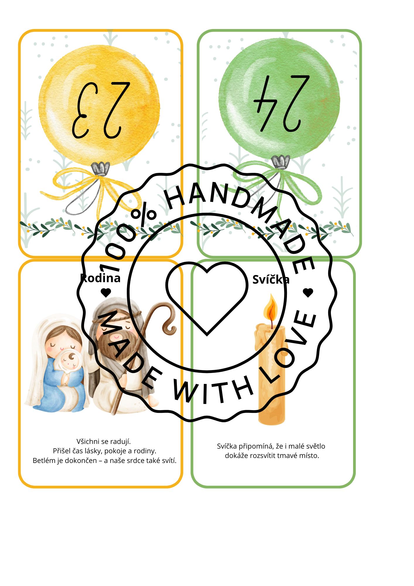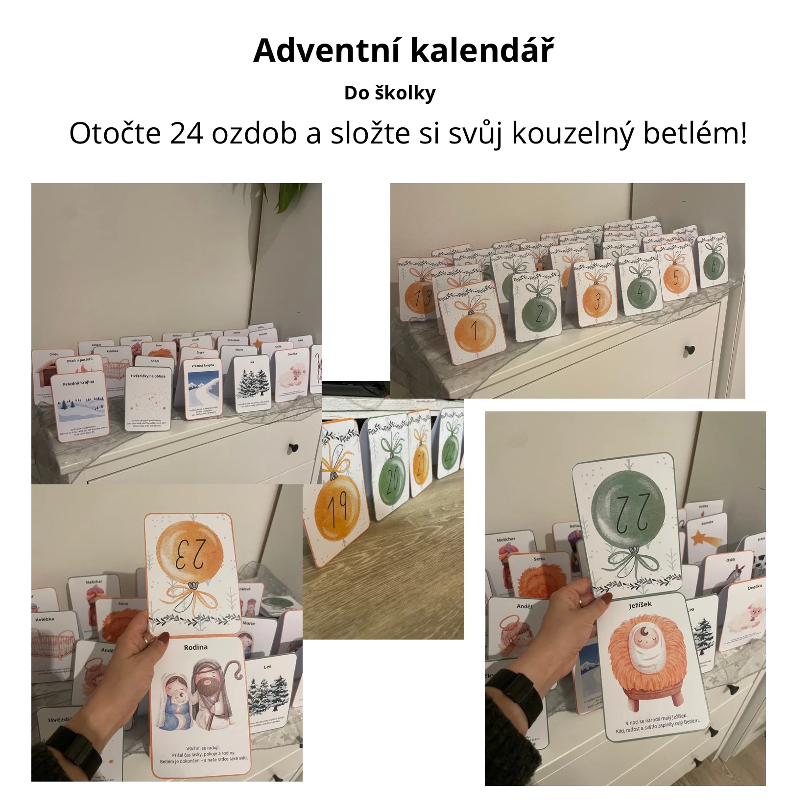 Tento adventní kalendář je vytvořen jako hravý a zároveň smysluplný materiál, který dětem přiblíží tradiční betlémský příběh jemnou a přístupnou formou. Každý den mohou děti otočit jednu ozdobu, objevit nový obrázek a krok za krokem skládat vlastní betlém. Materiál tak přirozeně podporuje dětskou představivost, trpělivost i radost z postupného objevování.