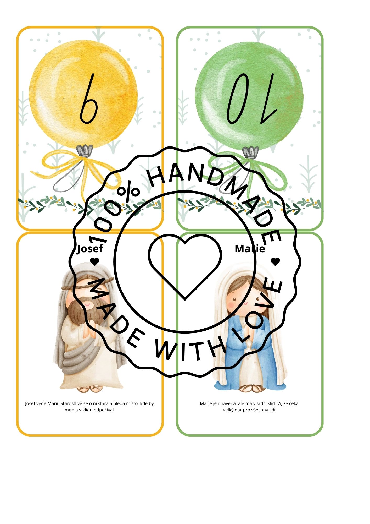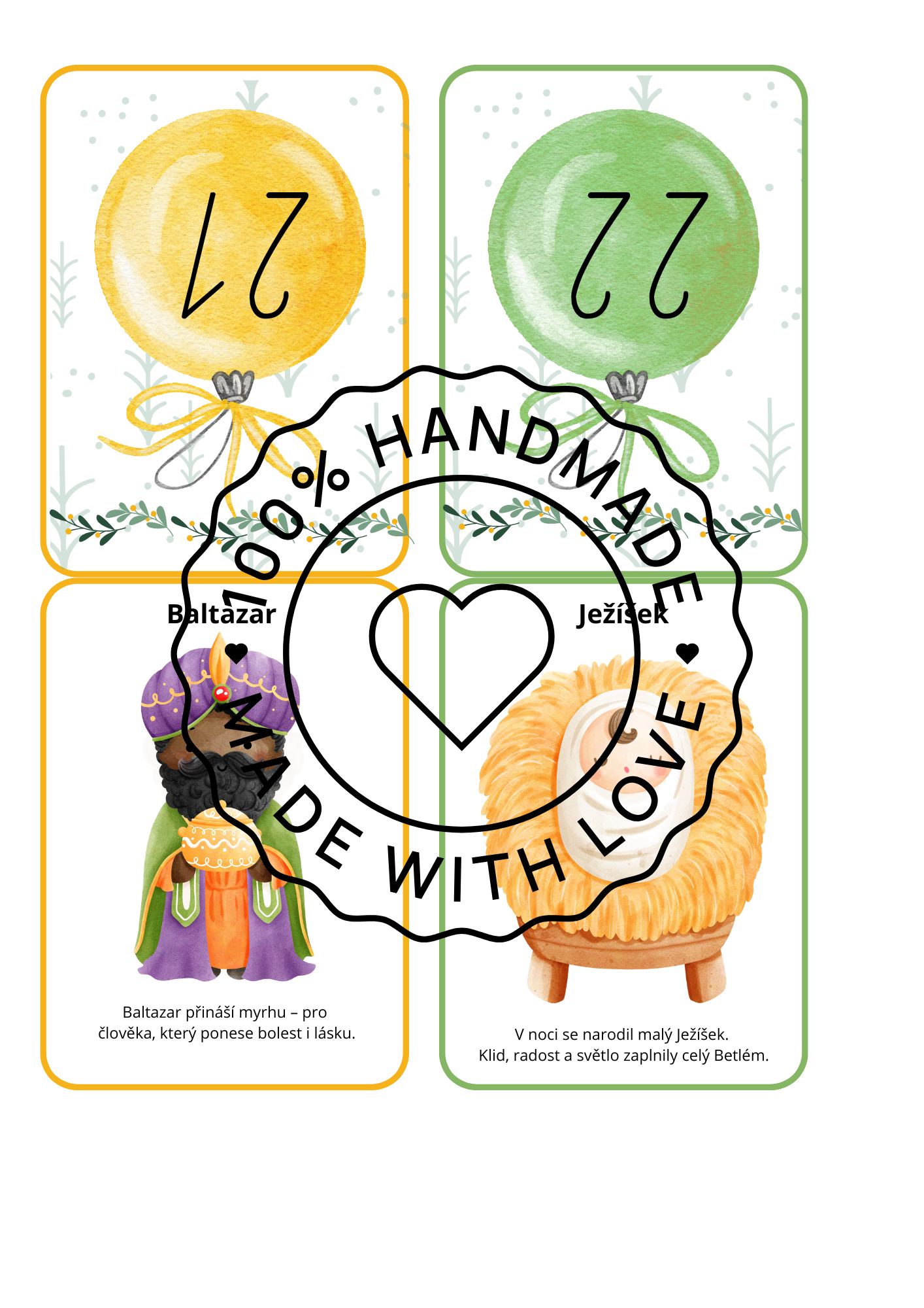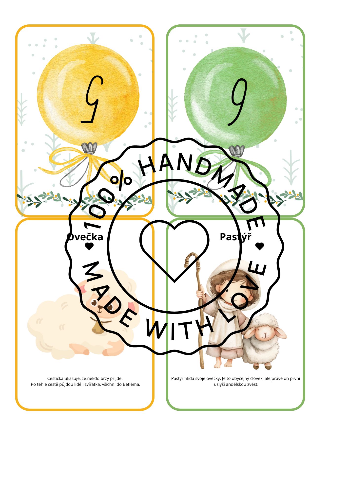 Tento adventní kalendář je vytvořen jako hravý a zároveň smysluplný materiál, který dětem přiblíží tradiční betlémský příběh jemnou a přístupnou formou. Každý den mohou děti otočit jednu ozdobu, objevit nový obrázek a krok za krokem skládat vlastní betlém. Materiál tak přirozeně podporuje dětskou představivost, trpělivost i radost z postupného objevování.