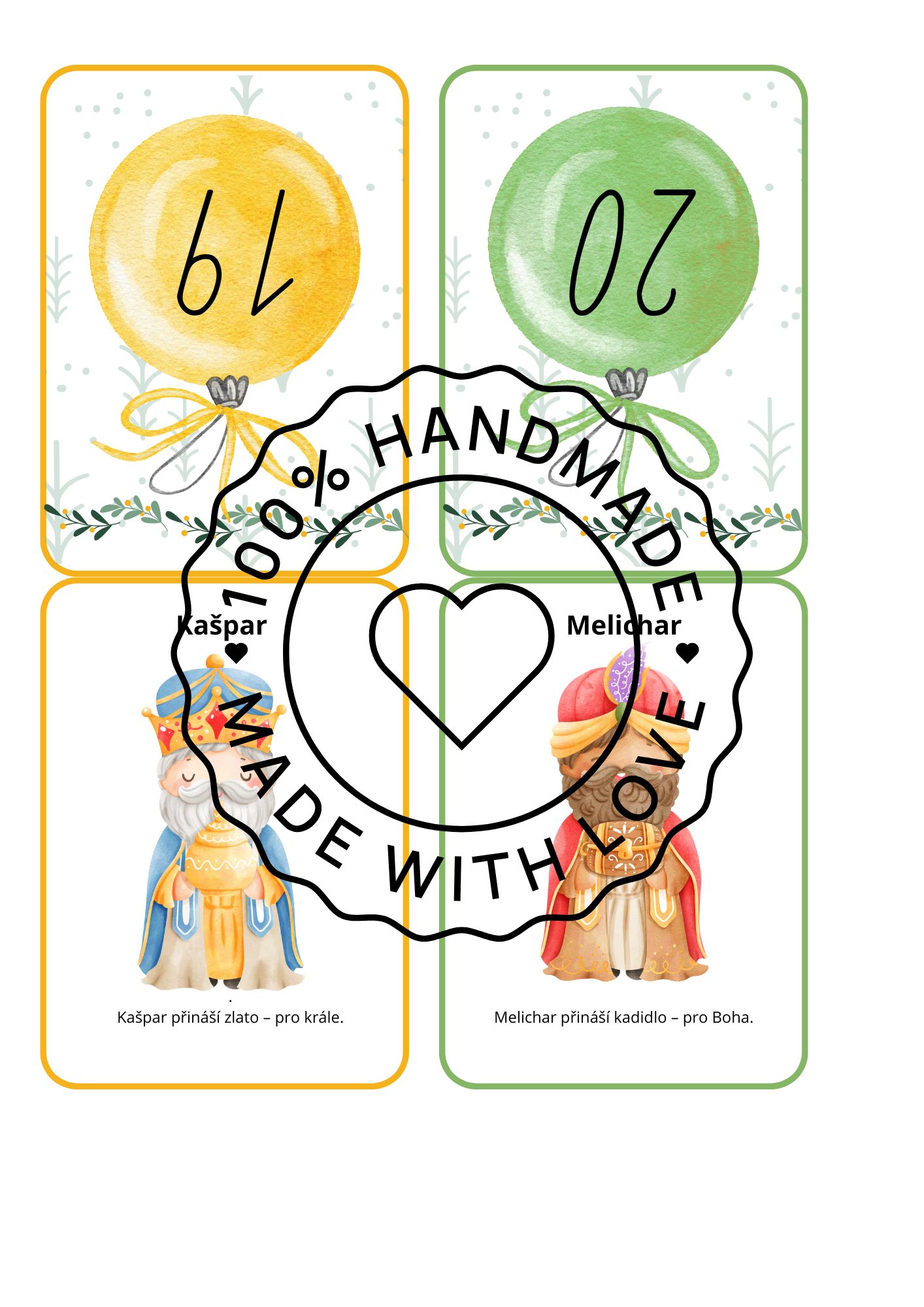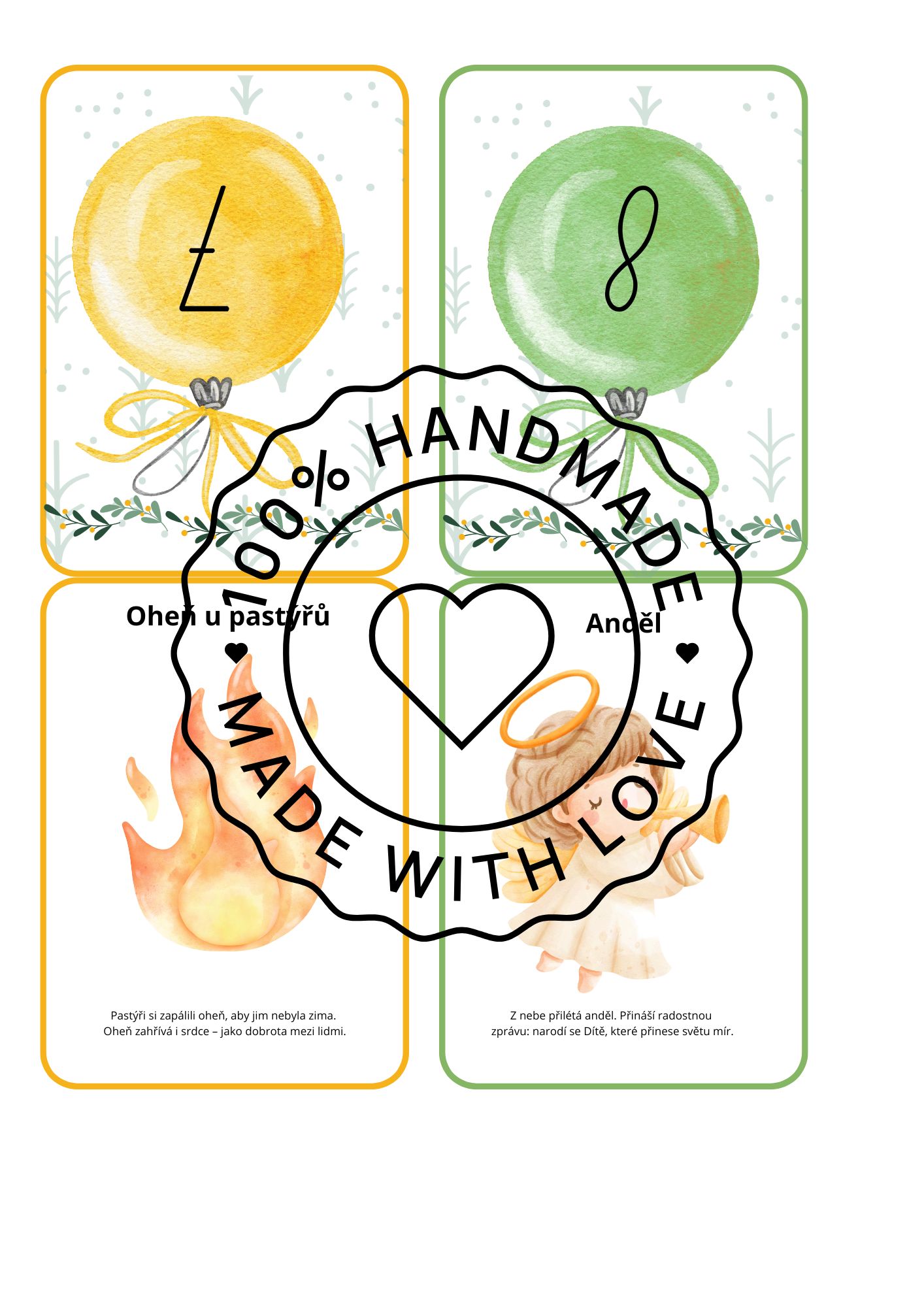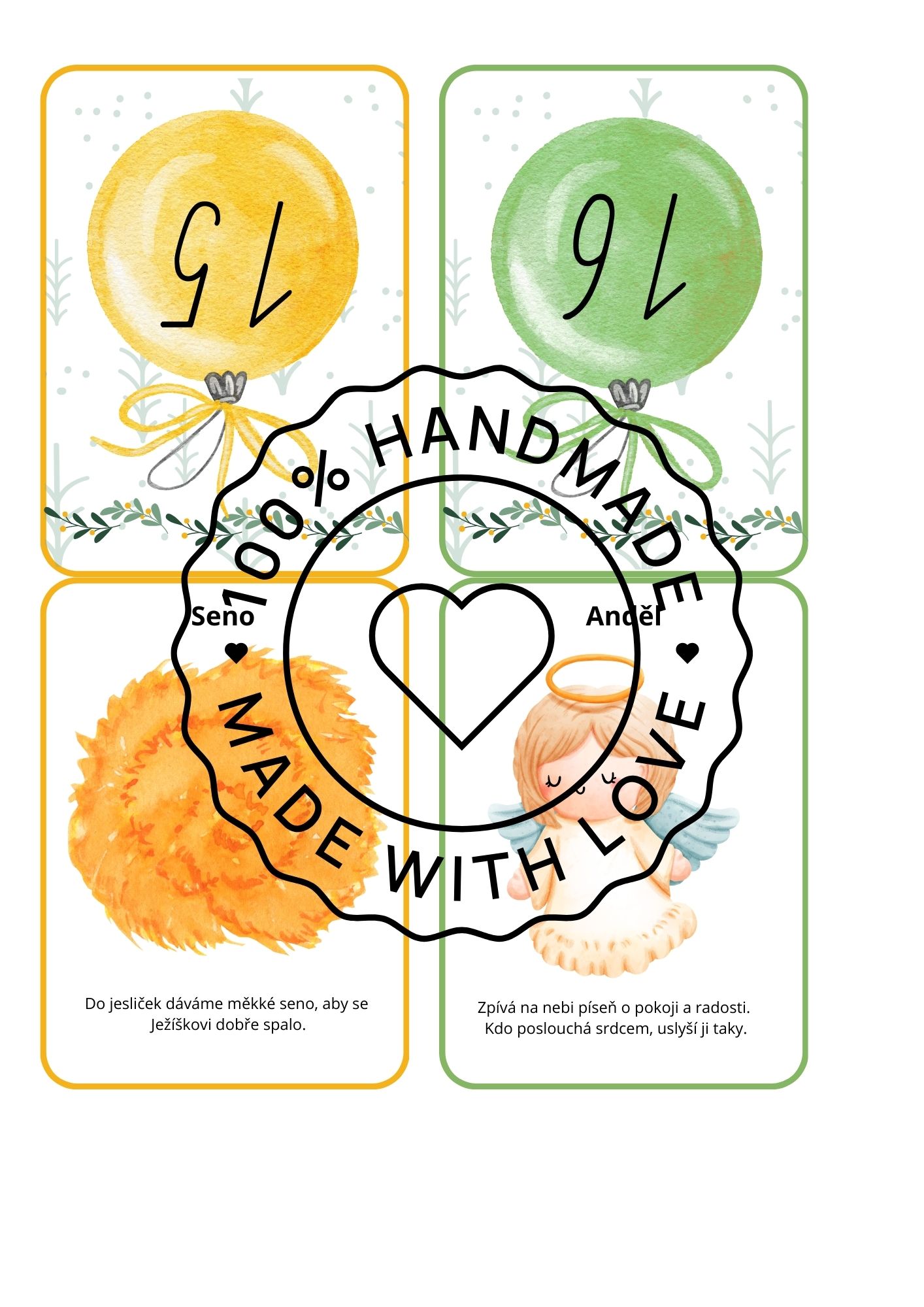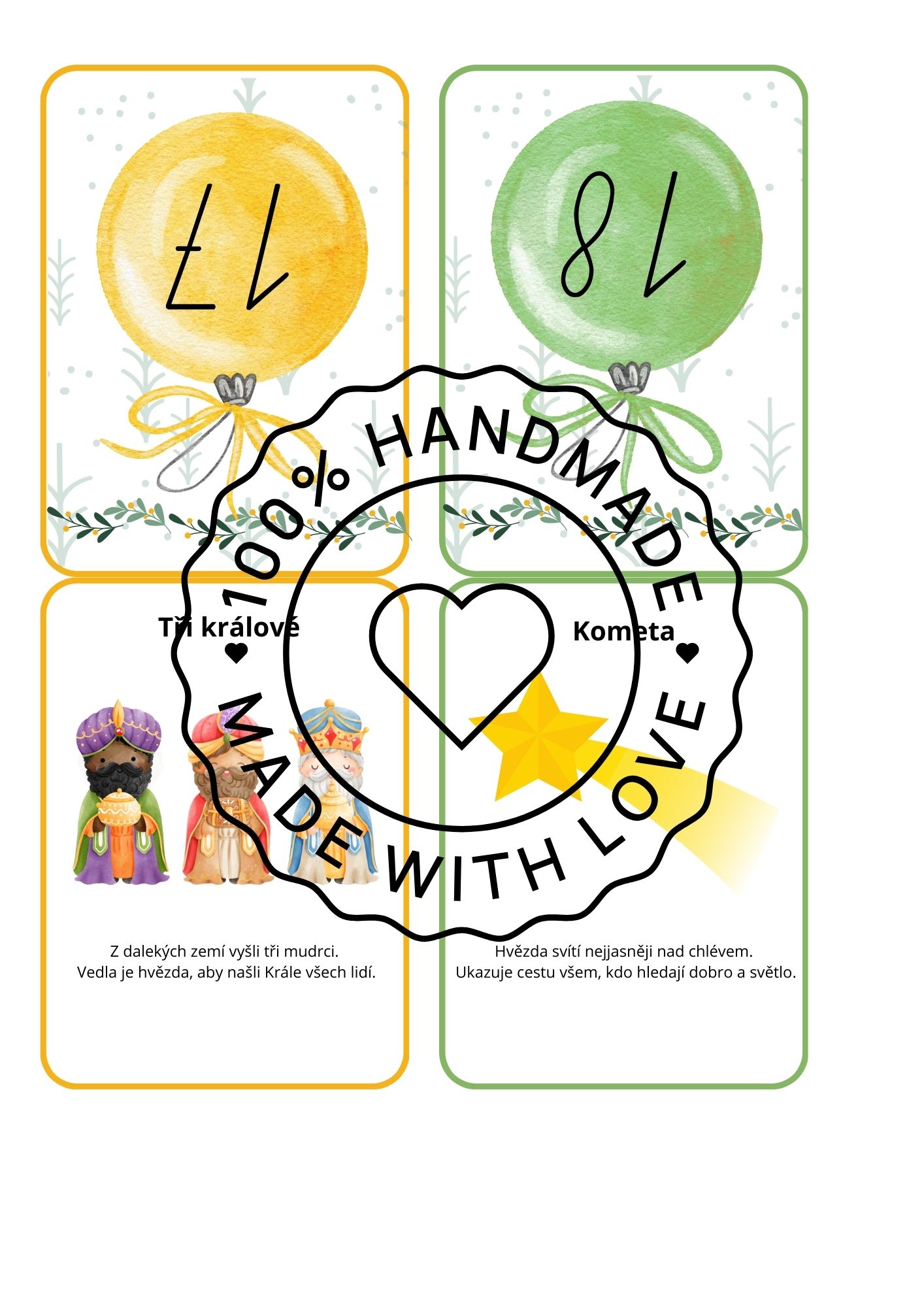 Tento adventní kalendář je vytvořen jako hravý a zároveň smysluplný materiál, který dětem přiblíží tradiční betlémský příběh jemnou a přístupnou formou. Každý den mohou děti otočit jednu ozdobu, objevit nový obrázek a krok za krokem skládat vlastní betlém. Materiál tak přirozeně podporuje dětskou představivost, trpělivost i radost z postupného objevování.