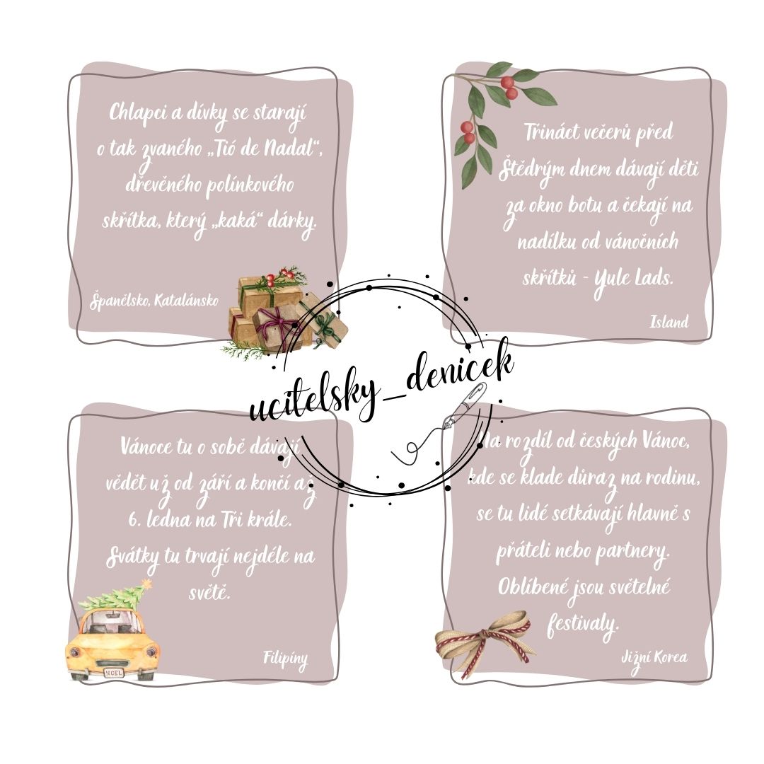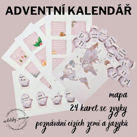 Materiál se skládá z 24 kartiček se zajímavými zvyky různých zemí světa, rukavicemi s nápisem Veselé Vánoce v příslušném jazyce a mapy světa v dekoru materiálu.