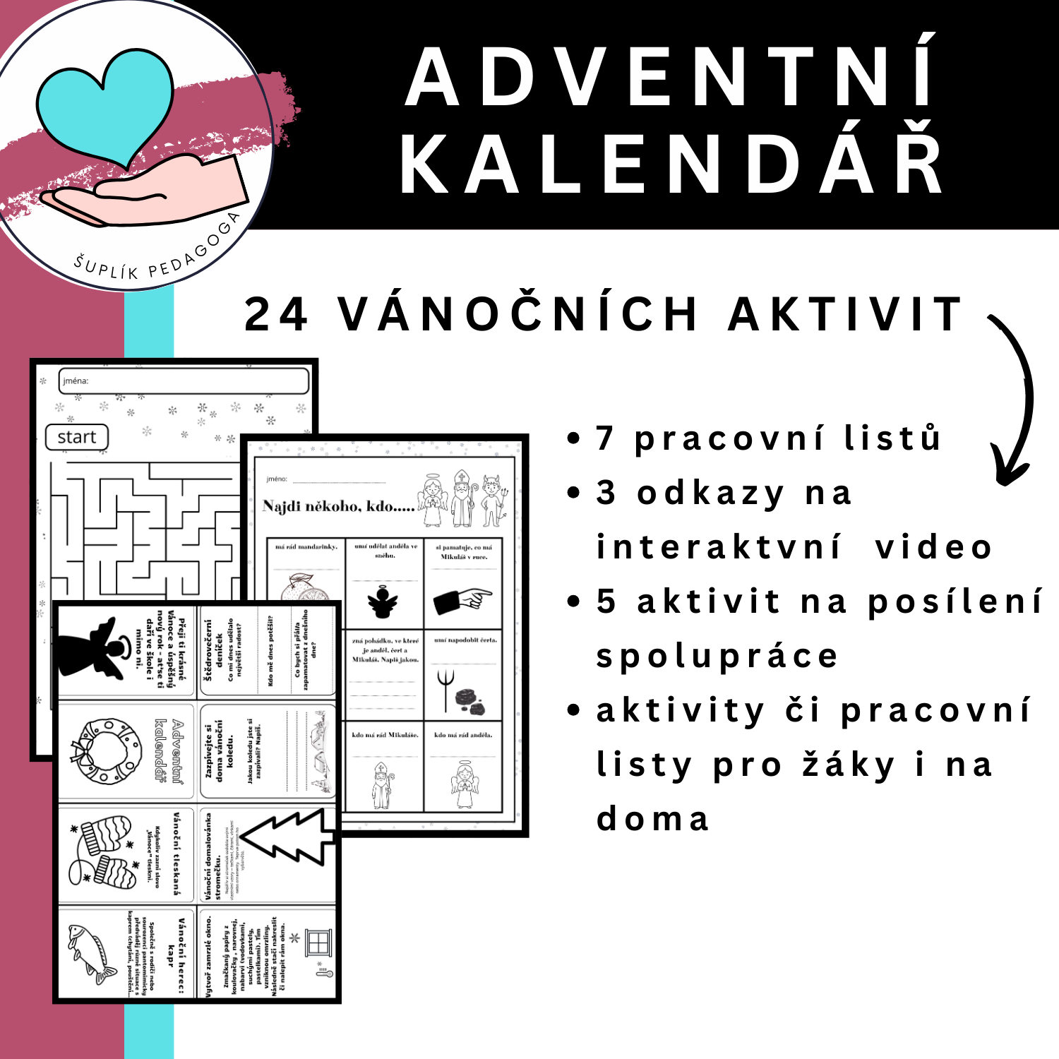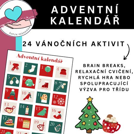 Každý den se v kalendáři skrývá malá aktivita – brain break, relaxační cvičení, rychlá hra nebo spolupracující výzva, která: rozhýbe tělo a probudí mysl, pomáhá zklidnit děti, pokud je potřeba, podporuje spolupráci a komunikaci, přináší radost a trochu vánočního kouzla do každého dne.