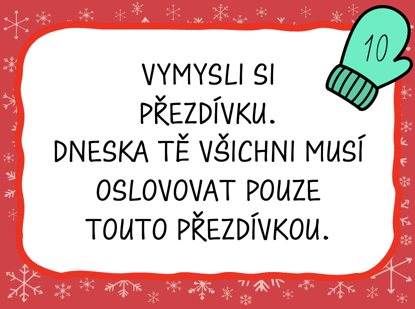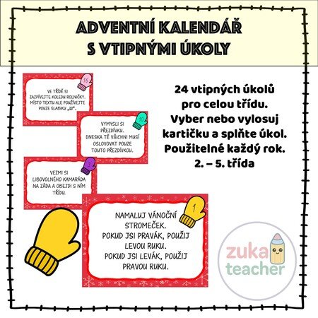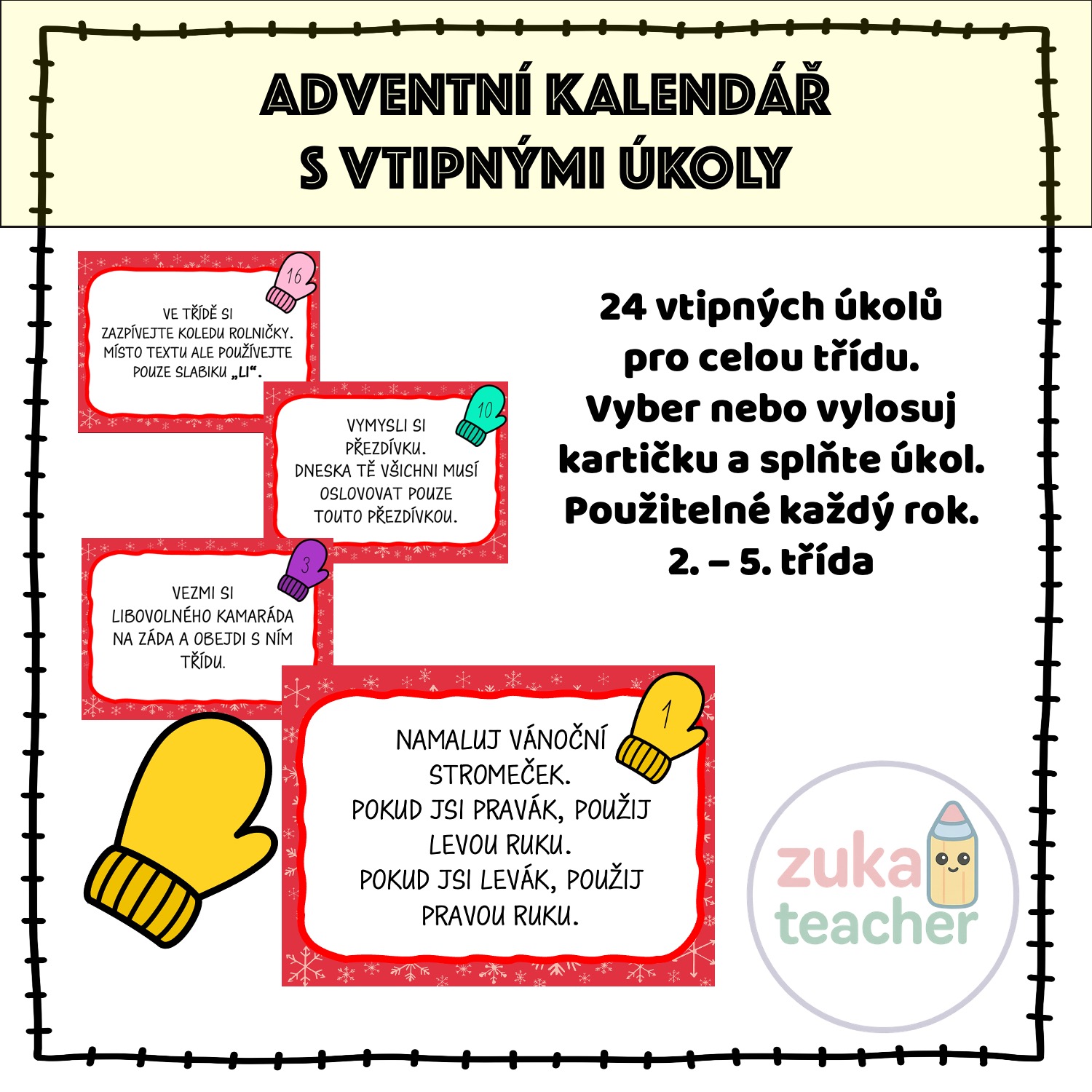 Materiál obsahuje 24 kartiček s úkoly. Ve třídě si kartičku vyberete – vylosujete.Poté celá třída úkol plní. Většina úkolů zabere jen pár minut a jsou různorodé – Soutěže, skládání básniček, zpívání nebo pohybové hry.