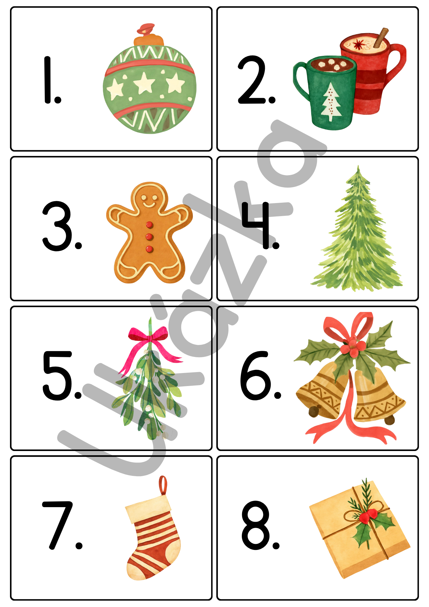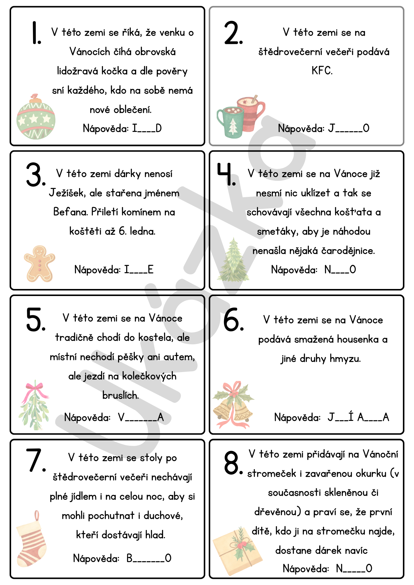 Materiál slouží jako adventní kalendář - obsahuje 24 kartiček se zajímavostmi z různých koutů světa ve formě hádanek. Kalendář slouží jako zpestření do výuky, který zároveň rozvíjí povědomí o odlišných kulturách a rozvíjí příjemnou vánoční atmosféru.