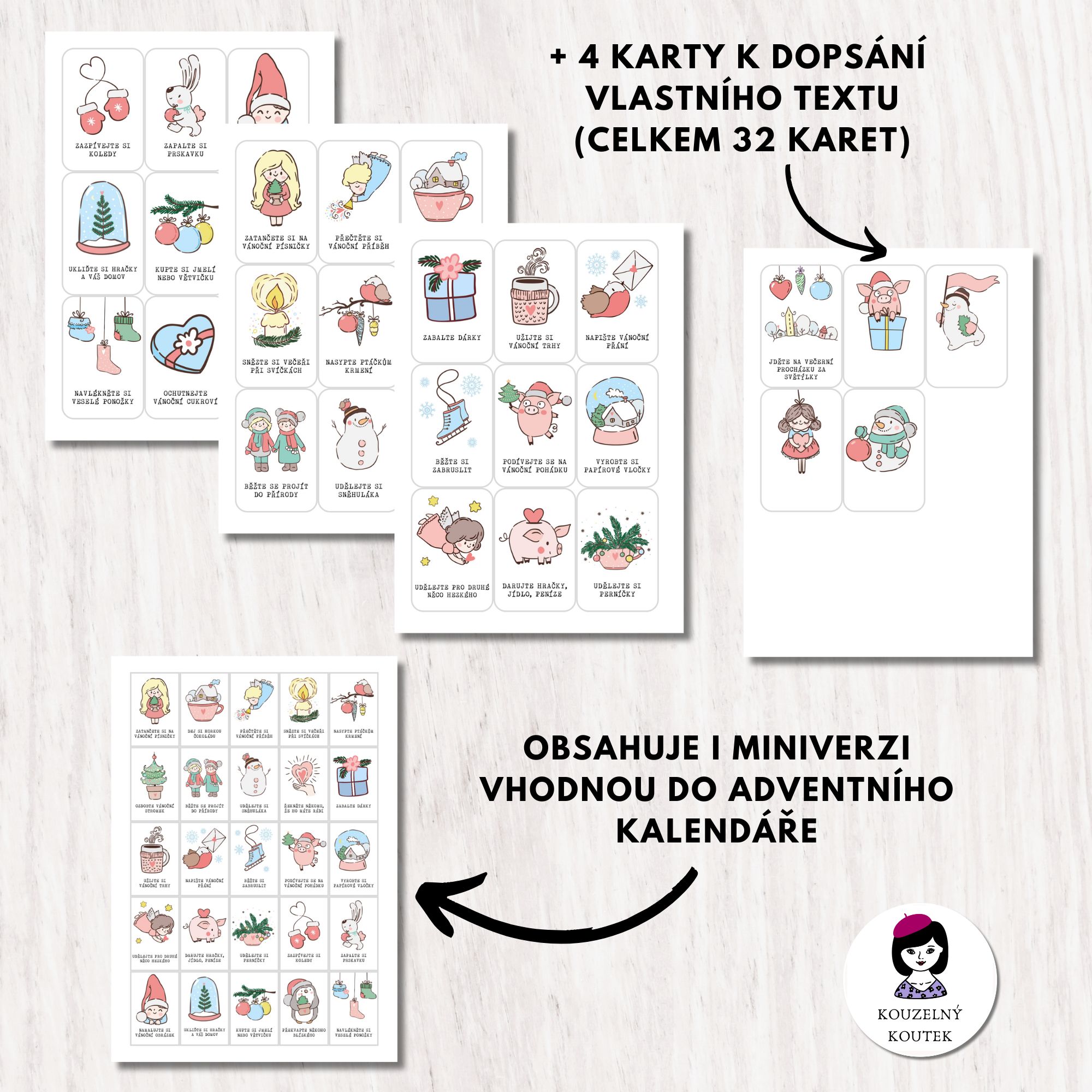 28 kartiček s úkoly a 4 kartičky pouze s obrázkem, pokud si chcete nějaký úkol dopsat. Mini kartičky se hodí do menších adventních kalendářů.