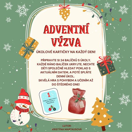 Už Vás nebaví klasické čokoládové kalendáře? Pojďte letos s dětmi prožít advent plný pohybu, zábavy a hravého učení! Připravila jsem pro Vás sadu 24 úkolových kartiček, které promění každé ráno v dobrodružství.