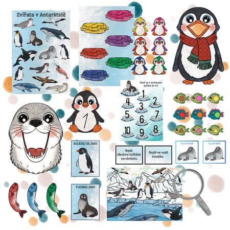 Velké i malé karty s ilustracemi a jednoduchými texty představují typická antarktická zvířata. Podporují rozvoj slovní zásoby, popisu, porozumění textu i zrakové diferenciace.