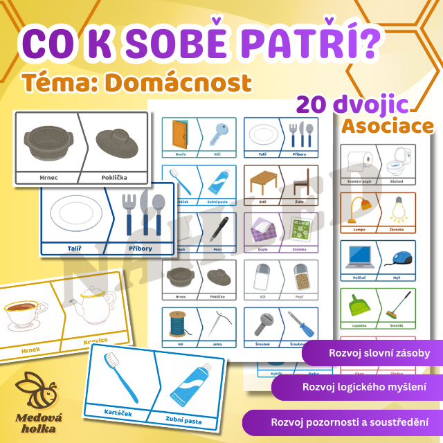 Materiál je zaměřen na rozvoj schopnosti poznávání souvislostí a třídění předmětů. Kartičky se nastříhají a následně se jednotlivé dvojice skládají k sobě. Hlavním cílem je, aby si děti uvědomily, že některé předměty patří k sobě, protože mají společnou funkci nebo se používají společně. Například pepř a sůl, talíř a příbory nebo televize a ovladač.