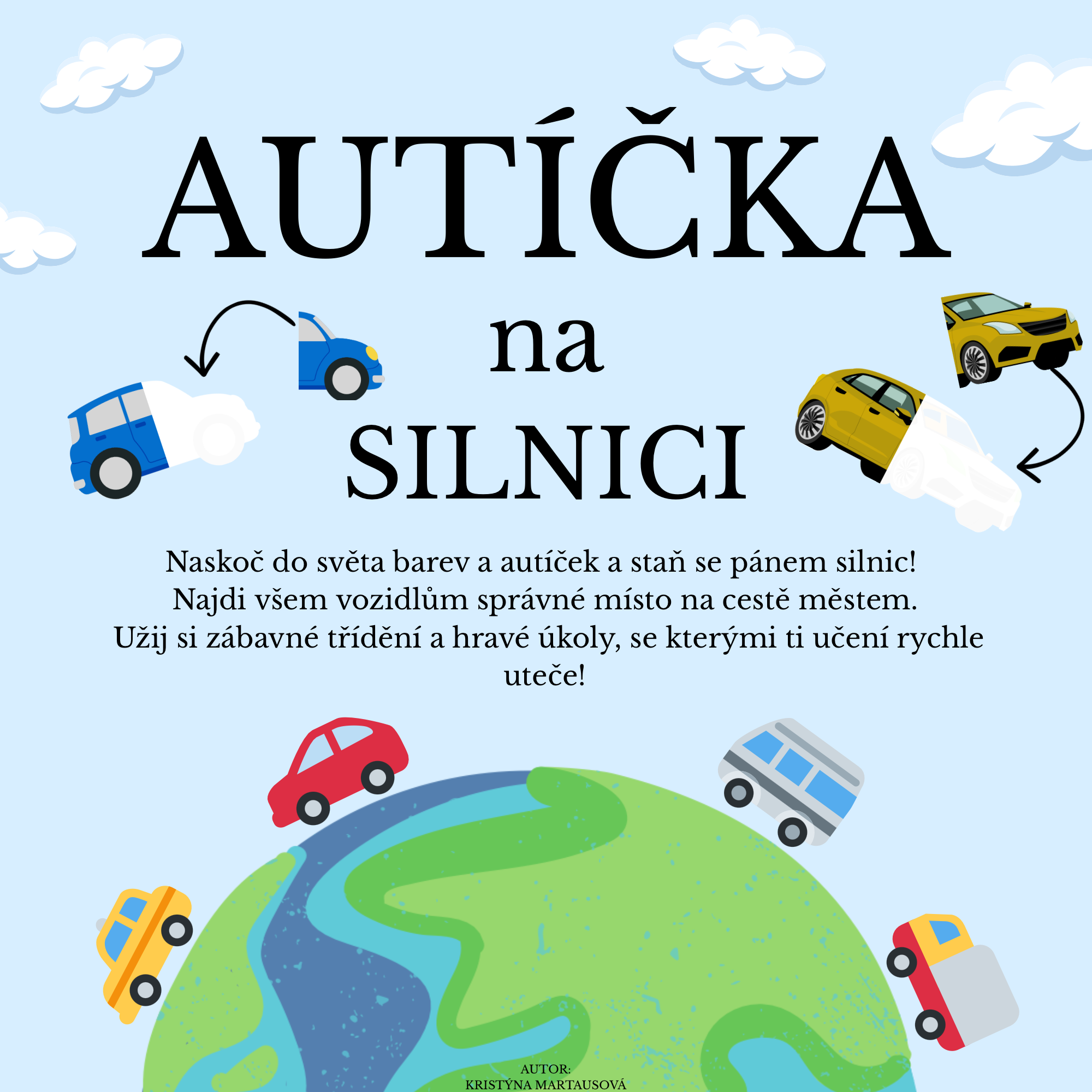 - Jemnou motoriku: Práce s drobnými výřezy autíček (stříhání, lepení nebo přikládání).