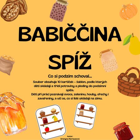 Soubor obsahuje 10 kartiček – šablon, podle kterých děti skládají a třídí potraviny a plodiny do podzimní spíže.