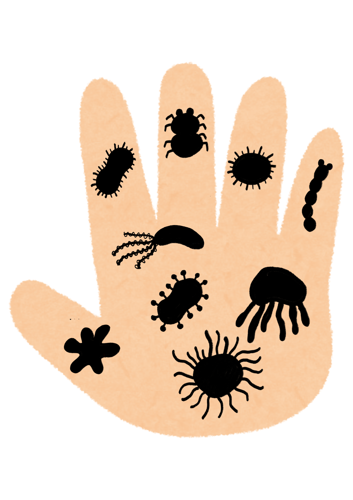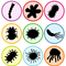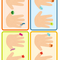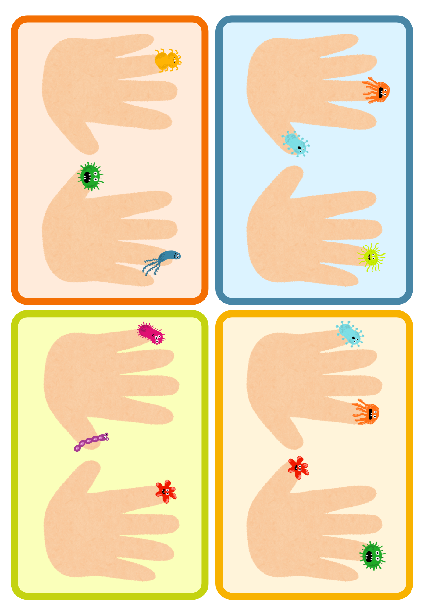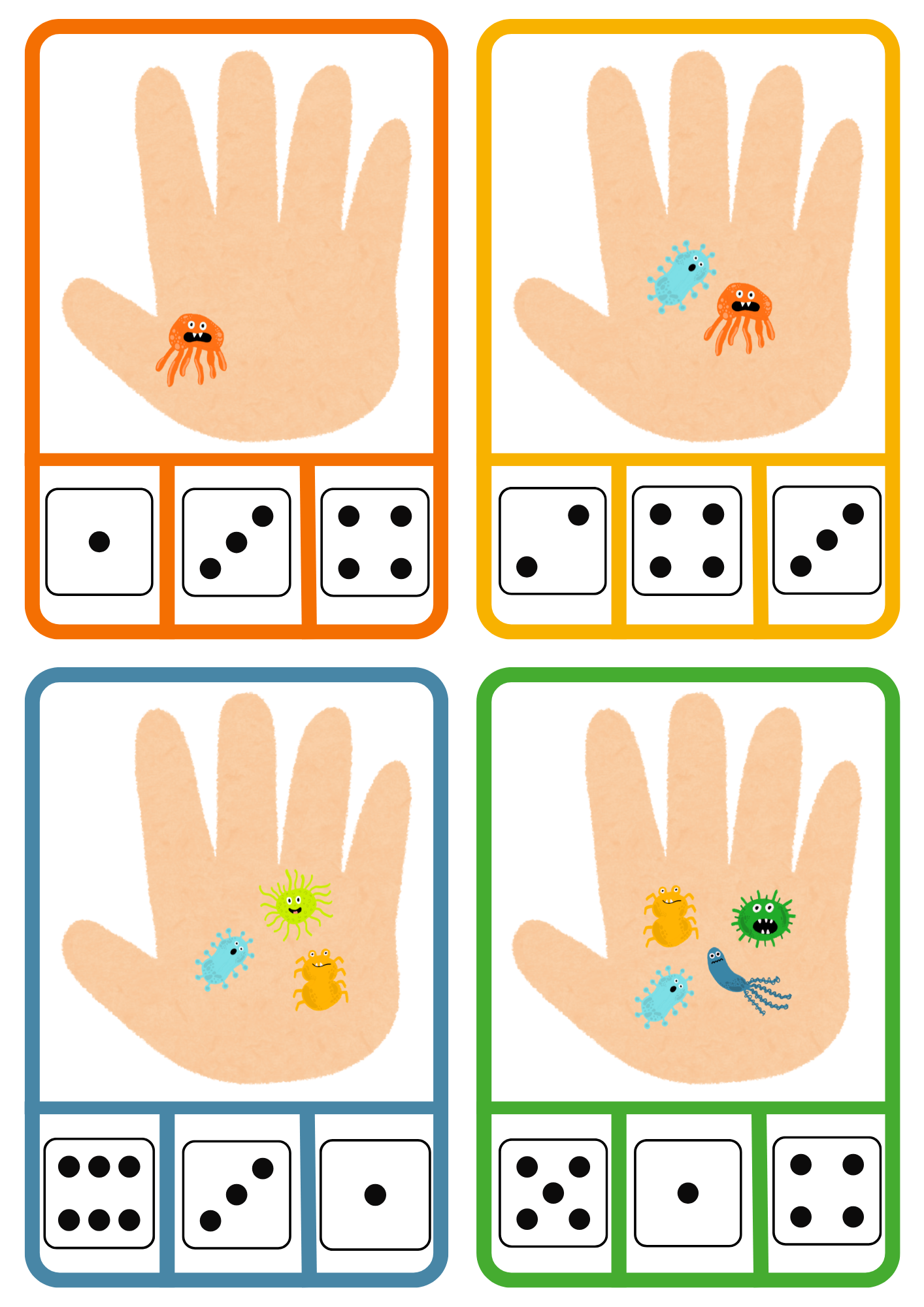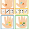 Děti řadí jednotlivé bacily na prsty na ruce, podle vzoru. Obsahuje 16 vzorových karet.