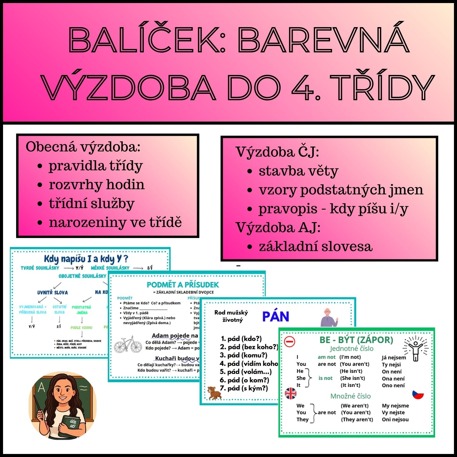 Tento soubor obsahuje 77 stránek plakátku pro výzdobu do 4. třídy: obecnou, do českého jazyka a do angličtiny (velikosti A4 a A5-lze vytisknout na A3) .