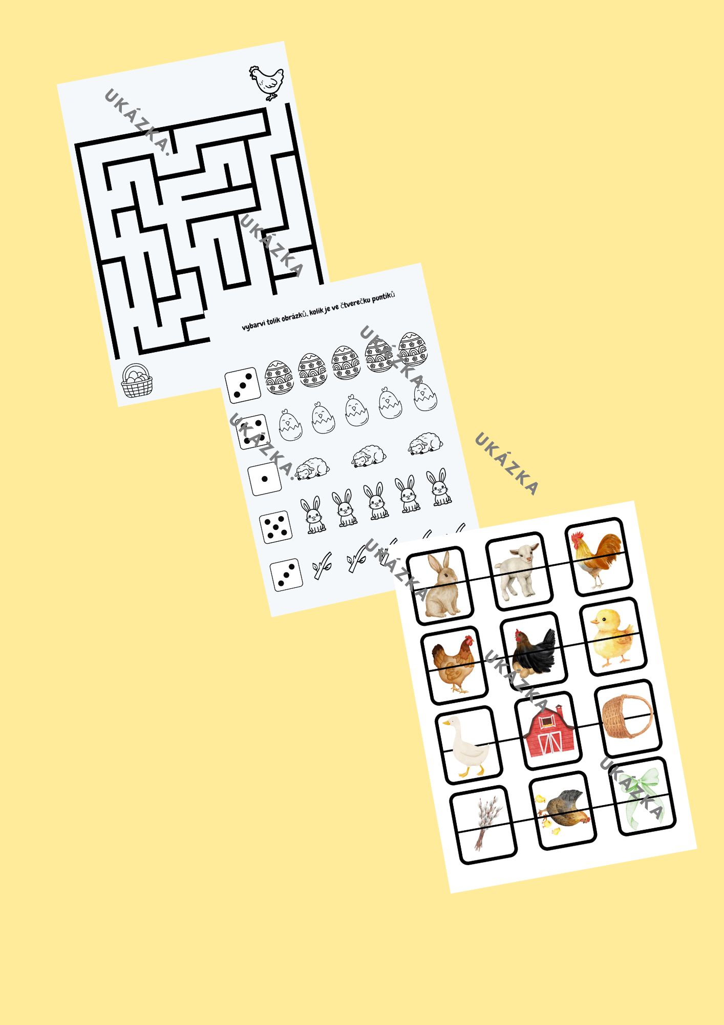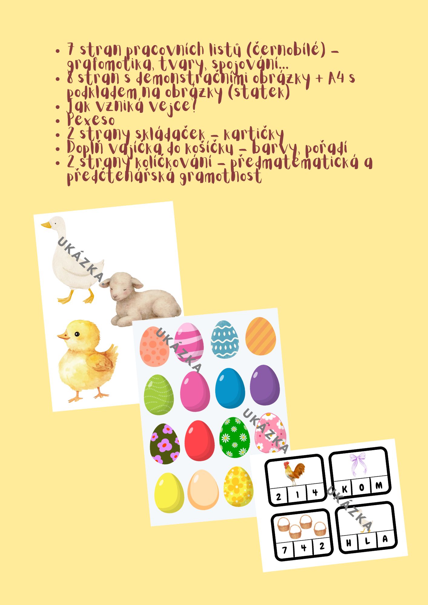 (grafomotorika, tvary, spojování, počítání, vybarvování podle zadání) - 8 stran demonstračních obrázků k tématu Velikonoc + A4 podklad (statek)