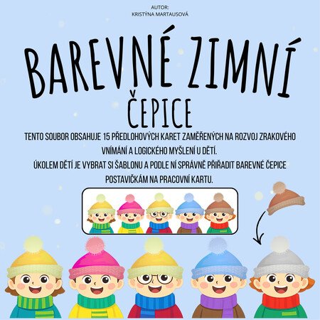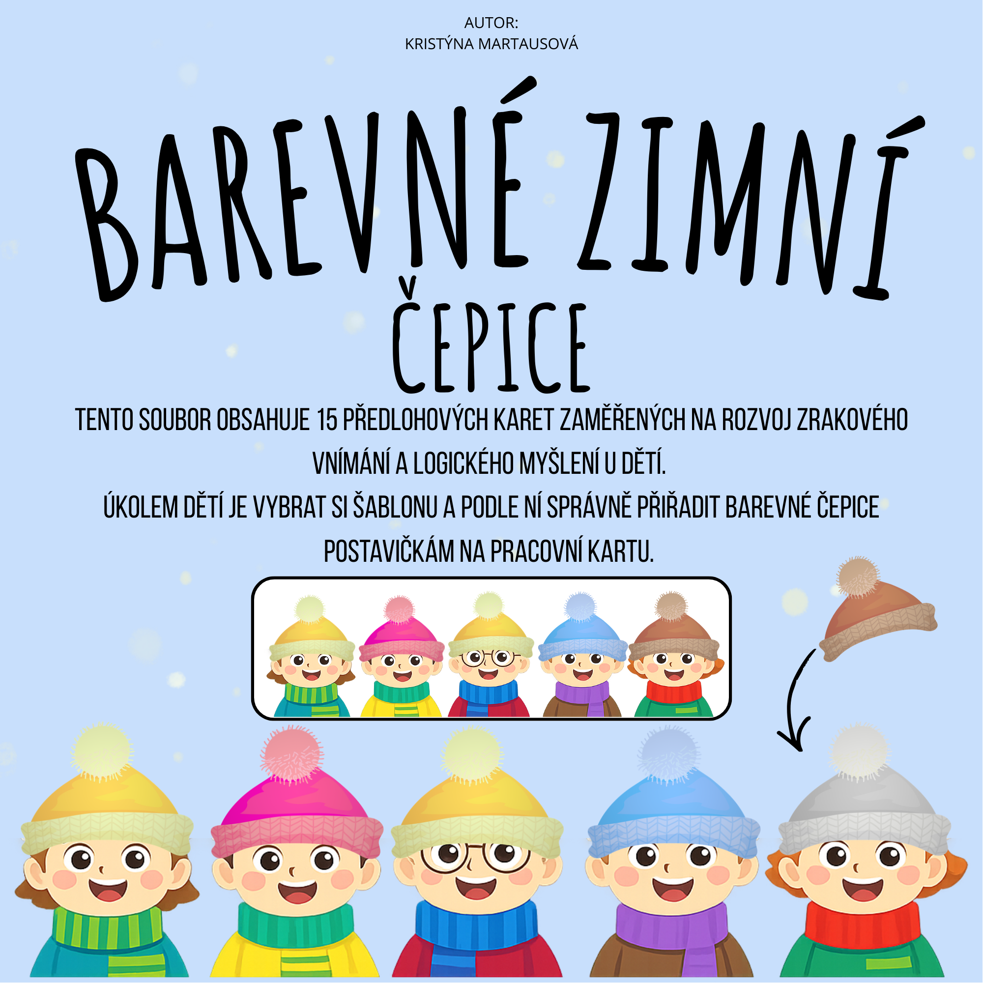 - Cíl: Podle zvoleného vzoru dítě správně přikládá barevné čepice na prázdnou pracovní kartu tak, aby barvy přesně odpovídaly zadání.