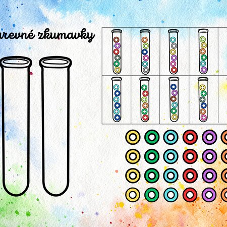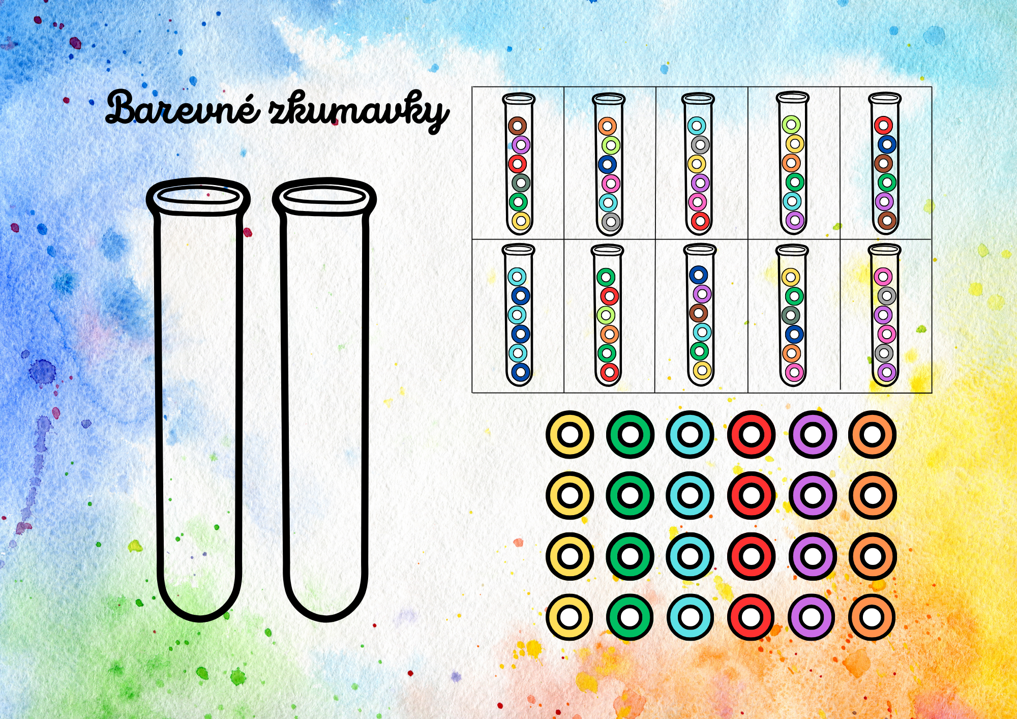 - Přehledné ilustrace zkumavek a barevných koleček vhodné pro nejmenší i starší děti