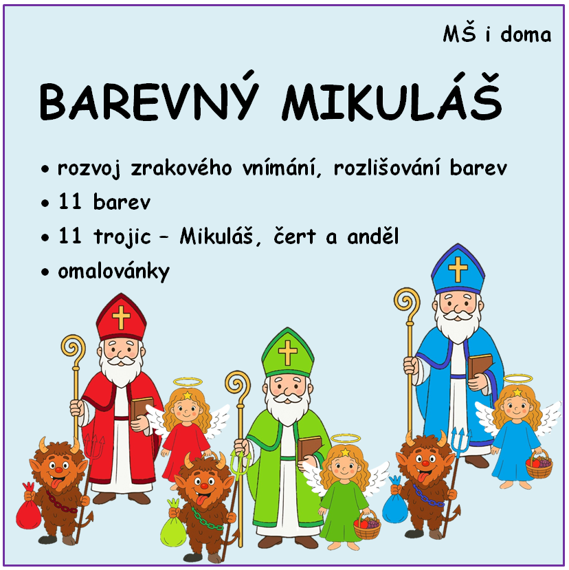 Materiál obsahuje 11 barev, 11 trojic Mikuláše, anděla a čerta, kteří patří k sobě + omalovánky.