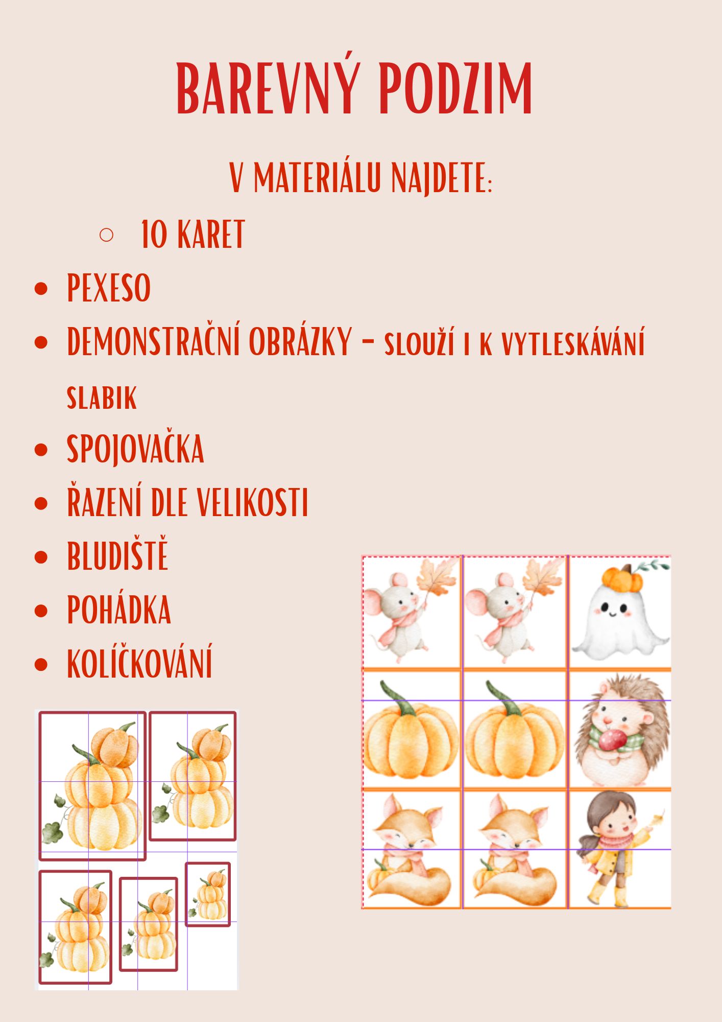 Tento soubor obsahuje 8 demonstračních karet, které slouží i k vytleskávání slabik. dále v souboru najdete 1 sadu pexesa, 2 pracovní listy (přiřaď co k sobě patří, bludiště), 2 sady na porovnávání dle velikosti, pohádka a 2 sady na kolíčkování. 🍂🍄