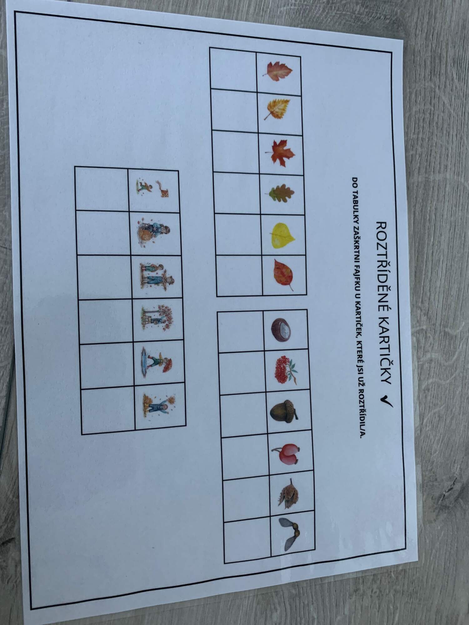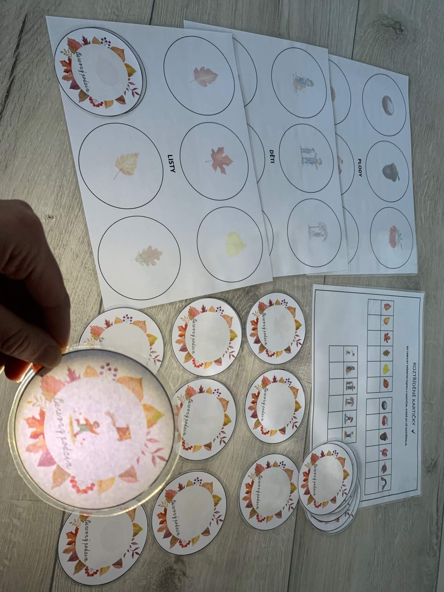 Úkolem dětí je obrázky prosvítit pomocí baterky a zjistit tak, co se skrývá uvnitř. Poté obrázky přiřadit na přikládací kartu. Poté pomocí mazatelného fixu zaznačit např. fajfkou nebo křížkem do karty ”Roztříděné kartičky ” ty obrázky, které jsou již odhaleny a přiřazeny na správnou přikládací kartu (DĚTI, PLODY, LISTY).