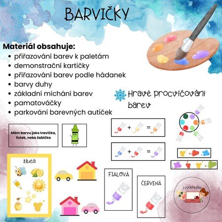 Tento soubor aktivit pomáhá dětem hravou formou objevovat svět barev, rozvíjí zrakové vnímání, paměť, logické myšlení i slovní zásobu. Pomůcka je ideální pro mateřské školy i domácí použití.
