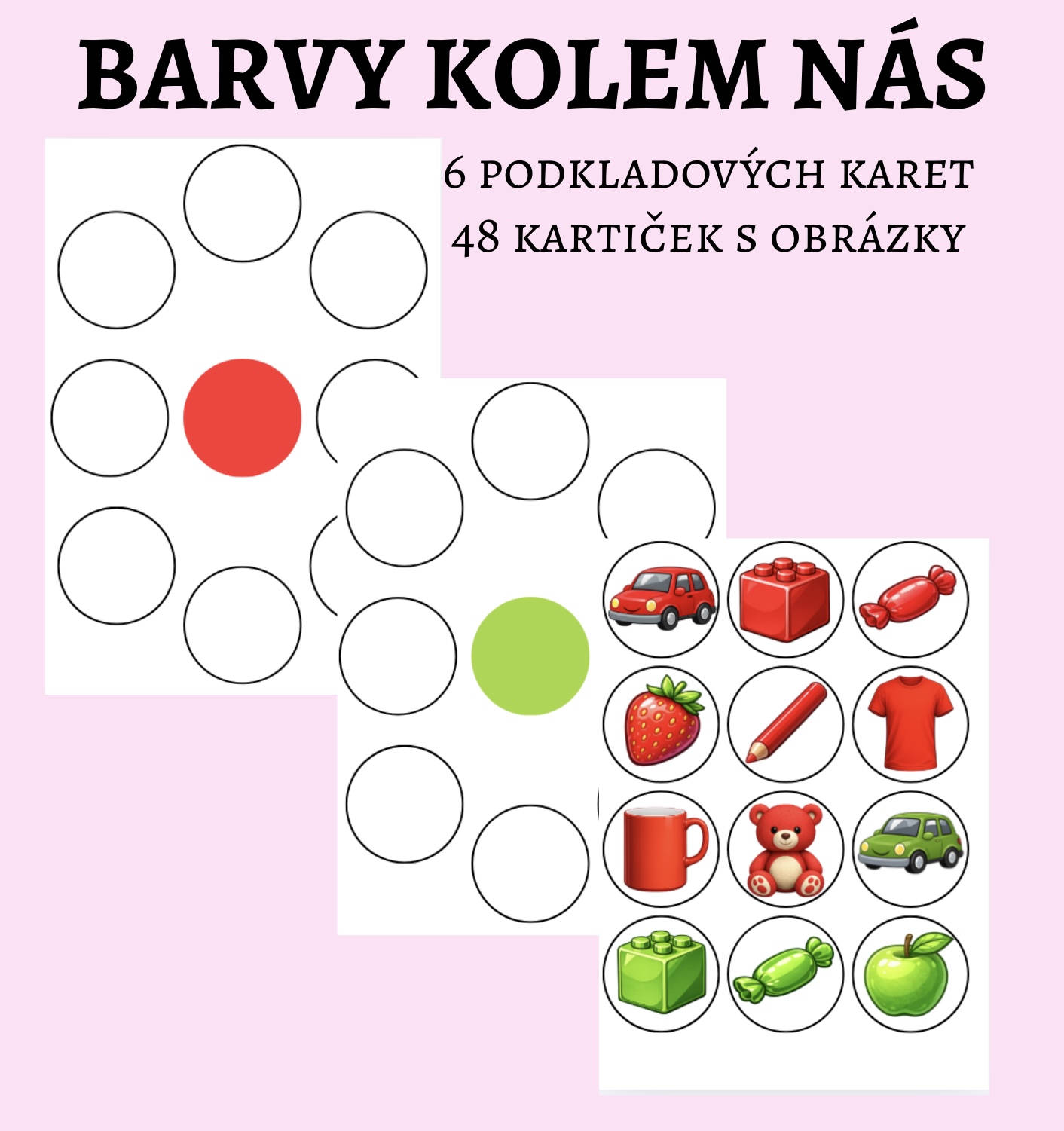 ✔️ 48 obrázkových kartiček s běžnými předměty (hračky, oblečení, jídlo, věci z domácnosti)