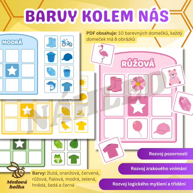 V materiálu se v jednotlivých barvách objevují také některé stejné obrázky (gumáky, kšiltovka, drahokam a tričko). Díky tomu si děti uvědomují, že stejný předmět může mít různé barvy. Současně zde najdete i barevné varianty některých motivů, například balónek (oranžový a růžový), klubíčko (zelené a fialové) nebo medvídka (růžového, fialového či hnědého). Můžete tedy pracovat i s tímto a podporovat tak u dětí schopnost soustředit se skutečně na barvu jako třídicí kritérium.