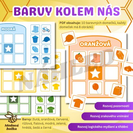Materiál slouží k hravému upevňování znalosti barev a k rozvoji třídění. Každý „domeček“ představuje jednu barvu (žlutá, oranžová, červená, růžová, fialová, modrá, zelená, hnědá, šedá a černá) a děti mají za úkol přiřazovat obrázky předmětů podle jejich barvy do správného domečku.