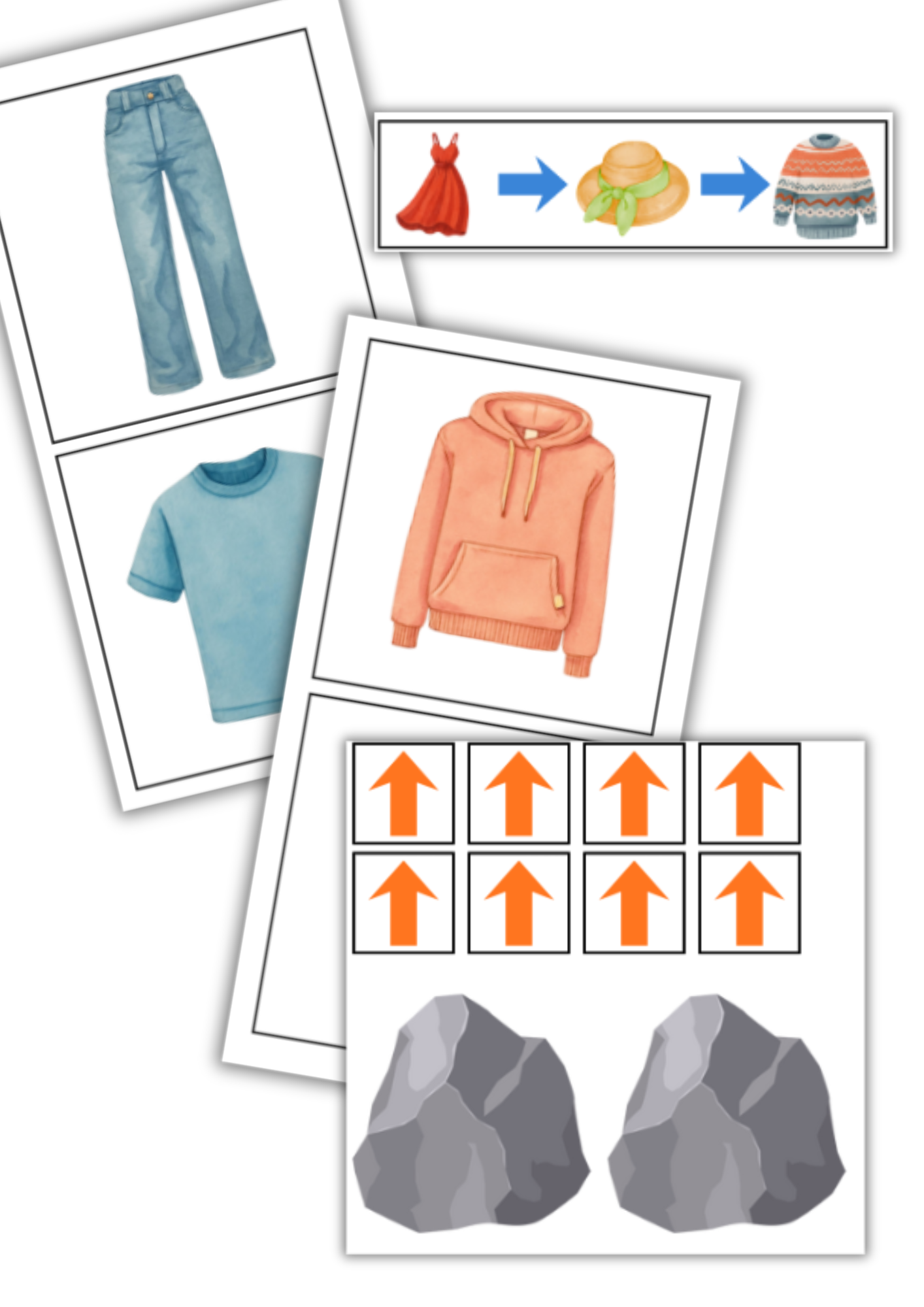🔹 12 demonstračních kartiček s oblečením (např. tričko, kalhoty, bunda, čepice, mikina, rukavice...) – rozměr 13,5 × 13,5 cm,