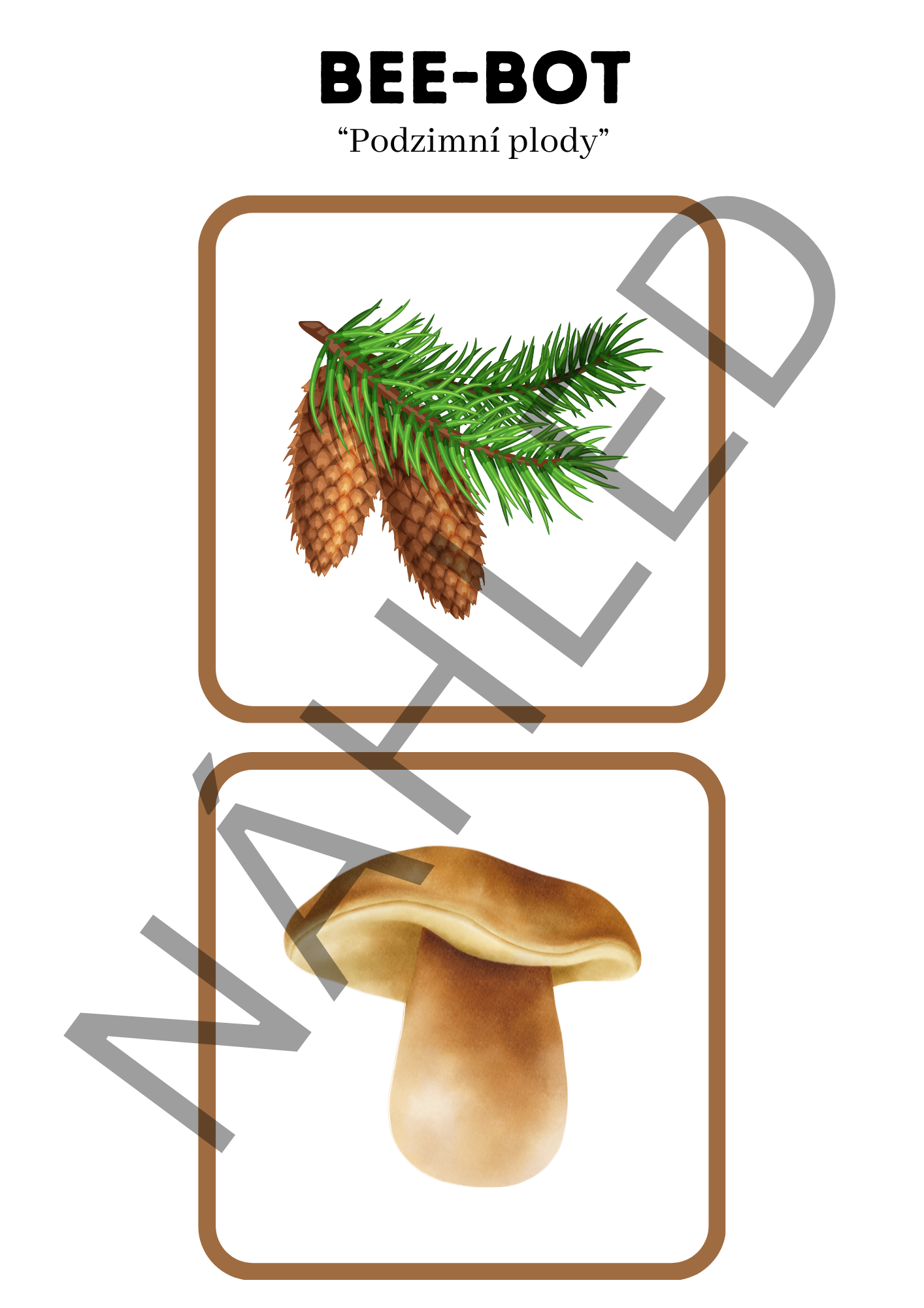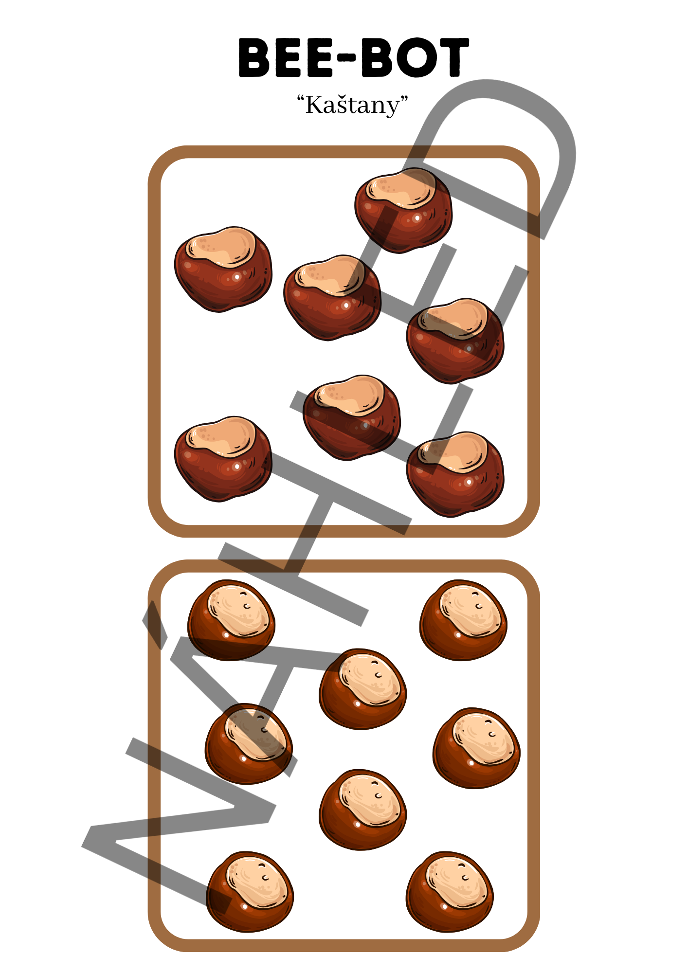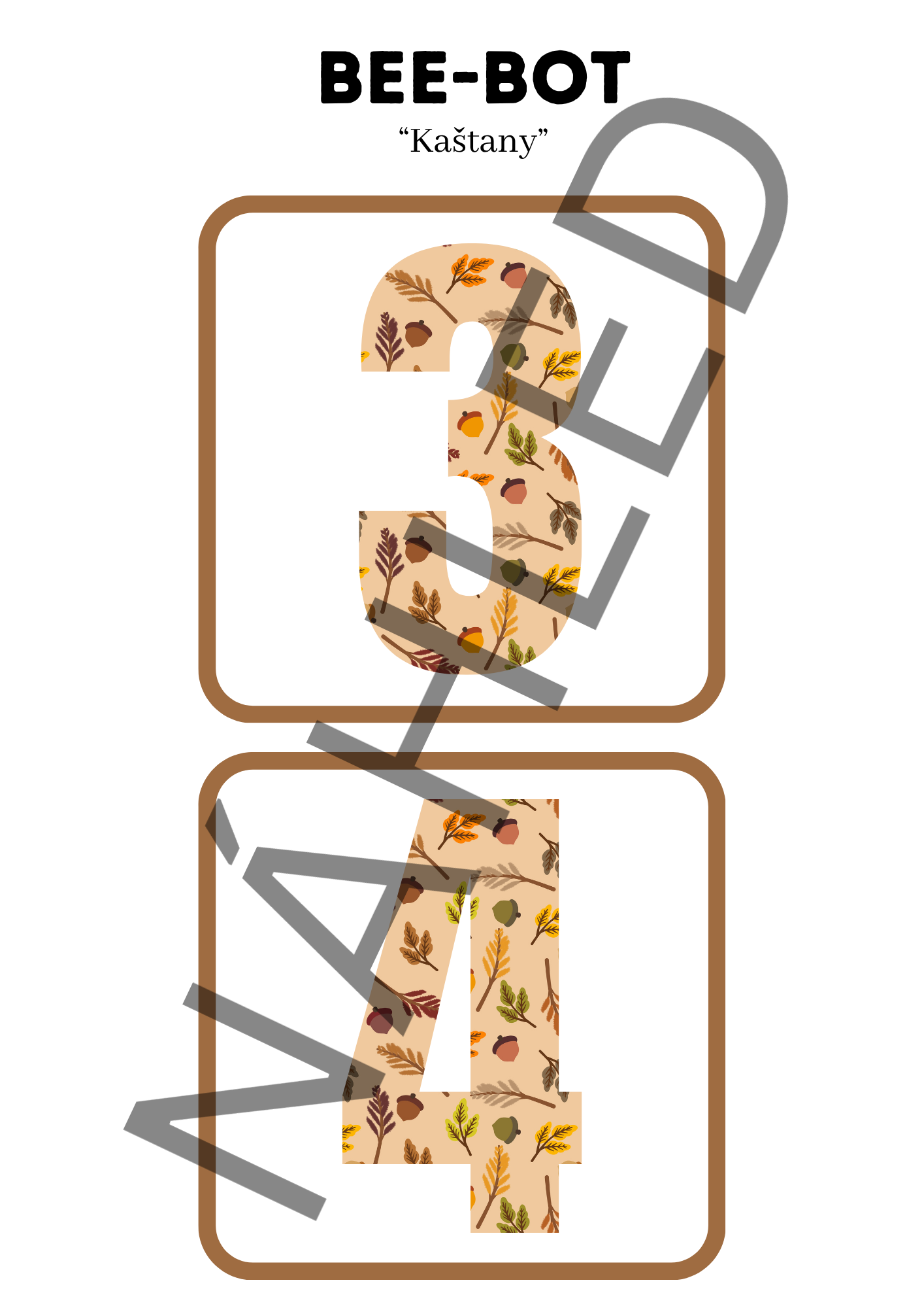 Soubor obsahuje dvě sady kartiček ve velikosti k využití do folie k bee-botům. Tato sada zahrnuje sadu karet s obrázky kaštanů, podzimních číslic a plodů podzimu. Kartičky lze využít i jako výzdobu.