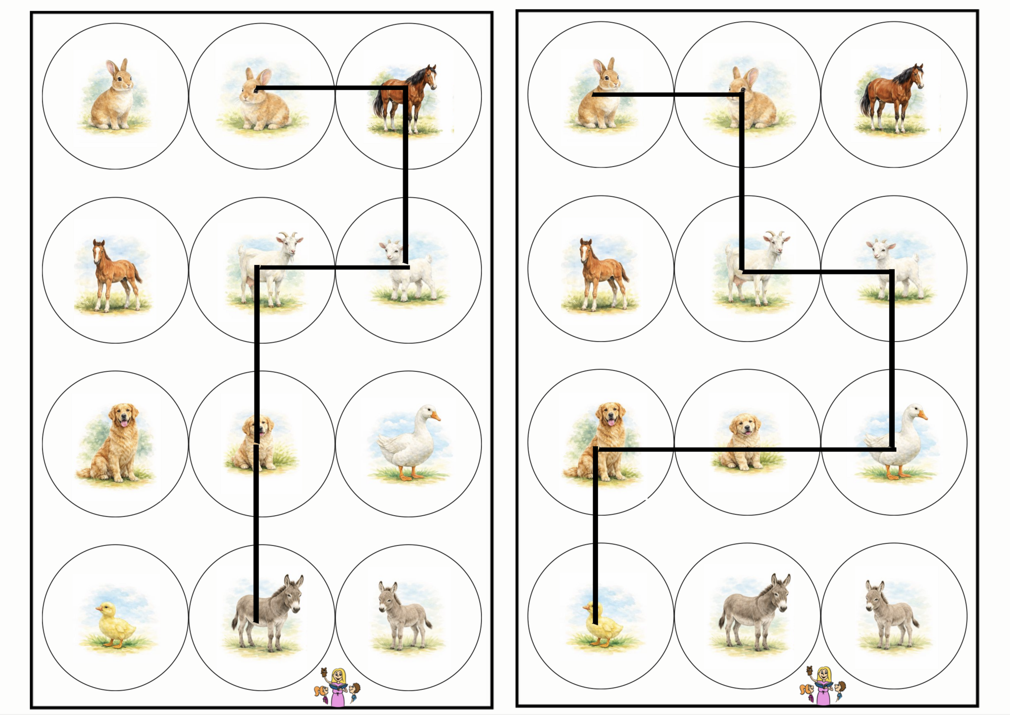 Děti procházejí bludištěm podle připravených předloh tras a postupně se orientují mezi obrázky zvířat. Během cesty pojmenovávají zvířata i jejich mláďata, procvičují slovní zásobu, rozvíjejí prostorovou orientaci a učí se soustředit na přesné zadání. Aktivita přirozeně podporuje také spolupráci – ostatní děti sledují správnost trasy a zapojují se jako pozorovatelé.