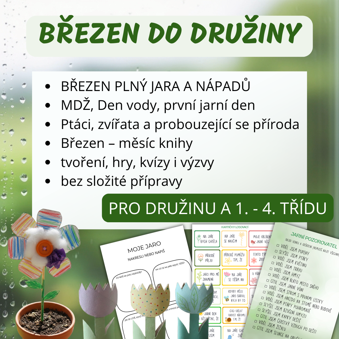 Materiál vznikl na základě mé vlastní praxe v družině a je sestaven tak, aby Vám co nejvíce usnadnil práci během celého měsíce března.Cílem materiálu je nabídnout pestrý, ale přehledně strukturovaný soubor aktivit, které můžete využívat postupně během měsíce – bez složité přípravy a dohledávání dalších podkladů.