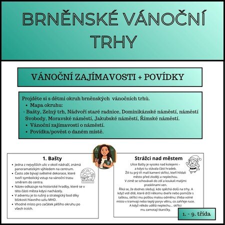 Využití: Vezměte děti na vánoční výlet a udělejte si okruh z Hlavního nádraží v Brně. Zastavte se na 8 vánočních místech a u každého místa si děti přečtou nebo paní učitelka vánoční zajímavosti a povídku.