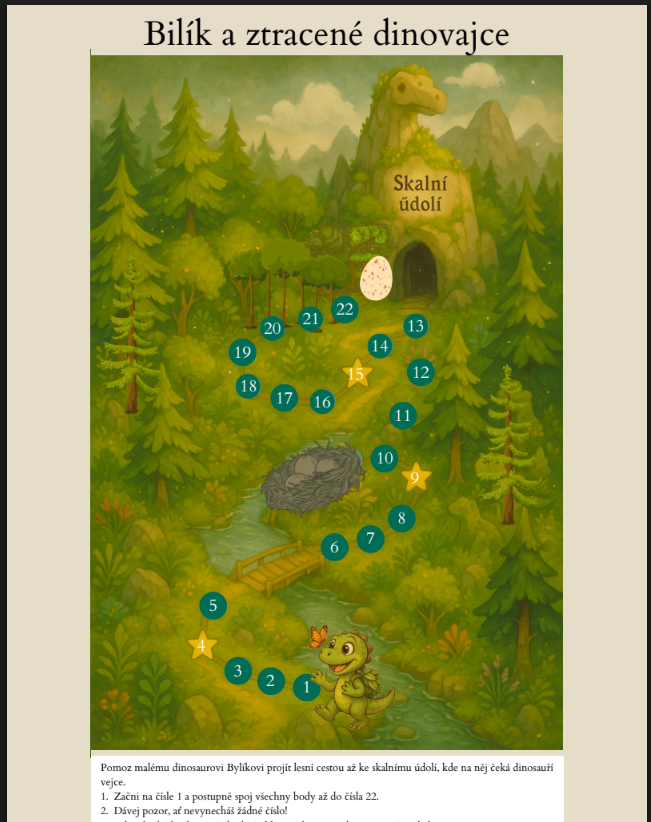 - Spojovačku s příběhem: Pomozte malému dinosaurovi Bylíkovi najít cestu k ztracenému vejci.