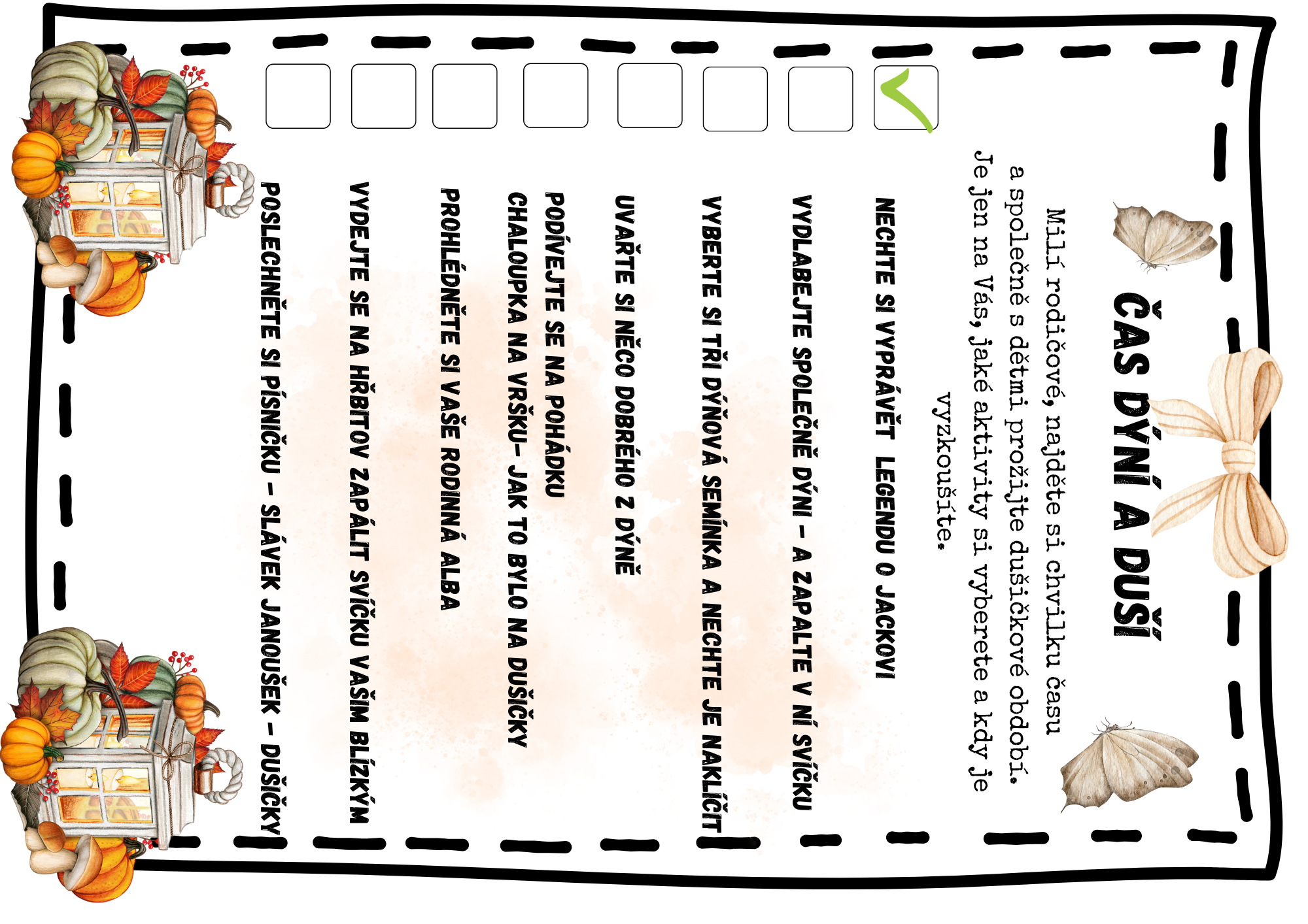 Obsahuje příběh o Jackovi a popis svátku všech svatých, Dušiček i Halloweenu. K rozstříhání a zalaminování jsou vhodné aktivity kolíčkování, rytmizace slov, posloupnosti. Nedílnou součástí mých materiálů je i charakteristika týdne, kterou je vhodné umístit do šatny rodičům.