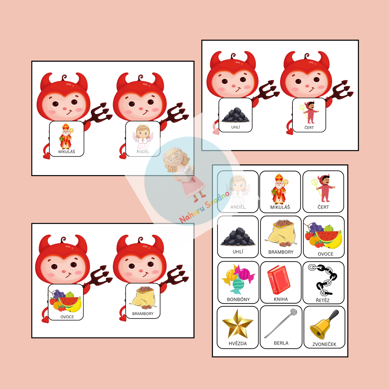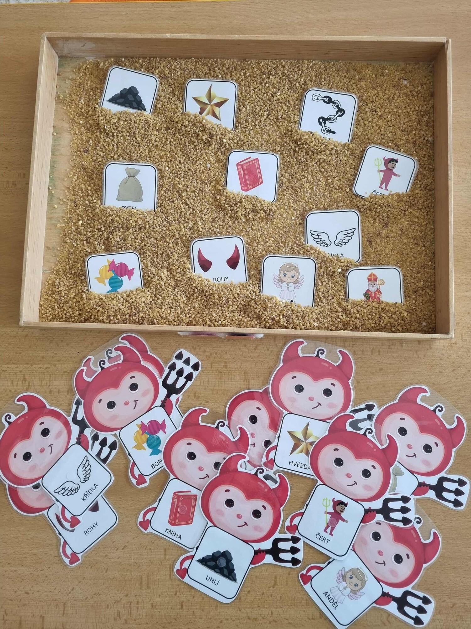 Rozlož čertíky a přidej malé obrázky z přiložených rámečků. Dítě přiřazuje obrázky k těm správným čertíkům. Skvělý způsob, jak procvičit porozumění slovům a rozšířit slovní zásobu.
