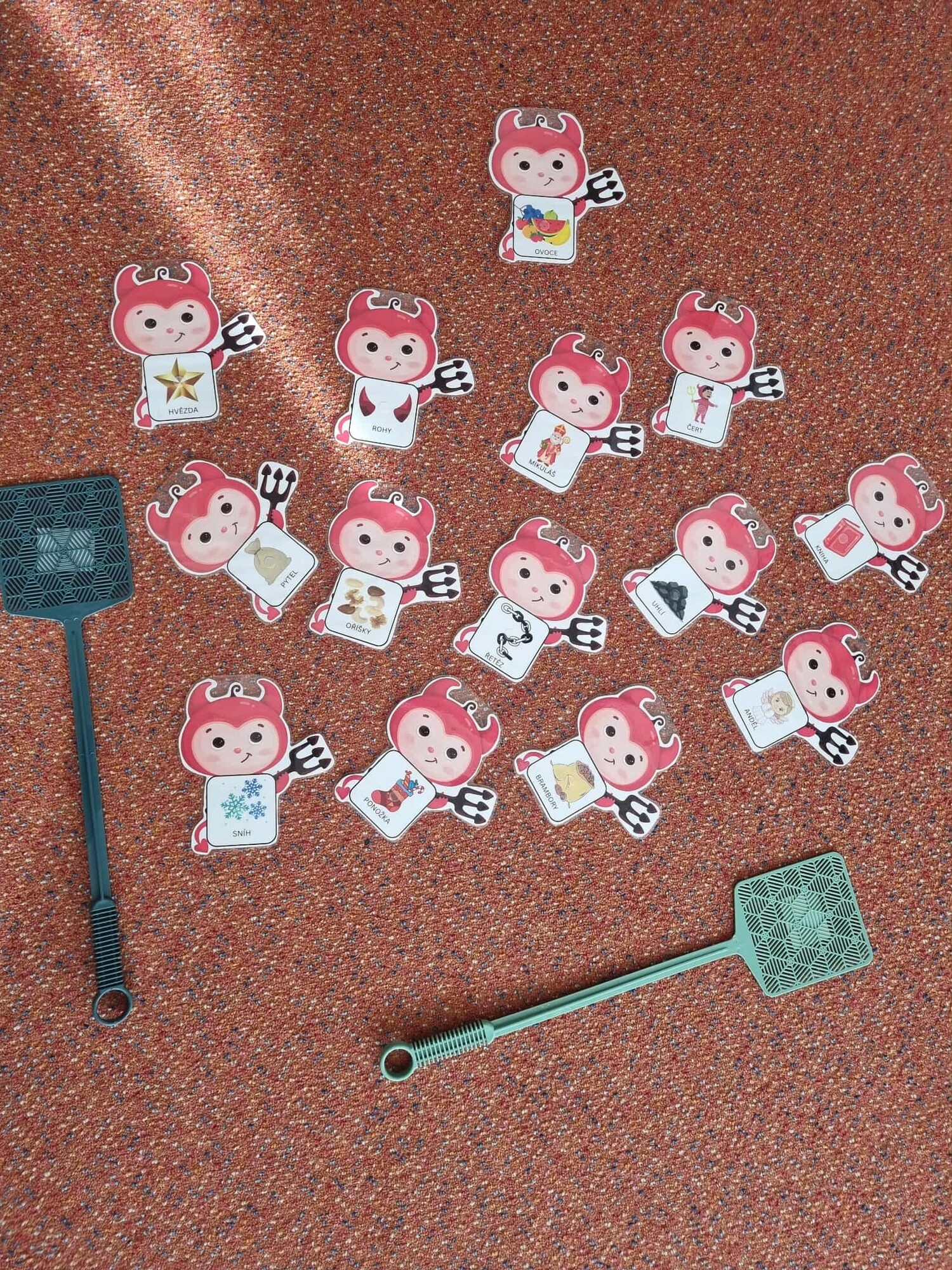 Soubor obsahuje 18 čertíků, z nichž každý má na sobě jeden obrázek – tedy i 18 slov k procvičení. Stačí čertíky vytisknout, vystřihnout a zalaminovat, vzít si dvě obyčejné plácačky na mouchy – a zábava může začít!