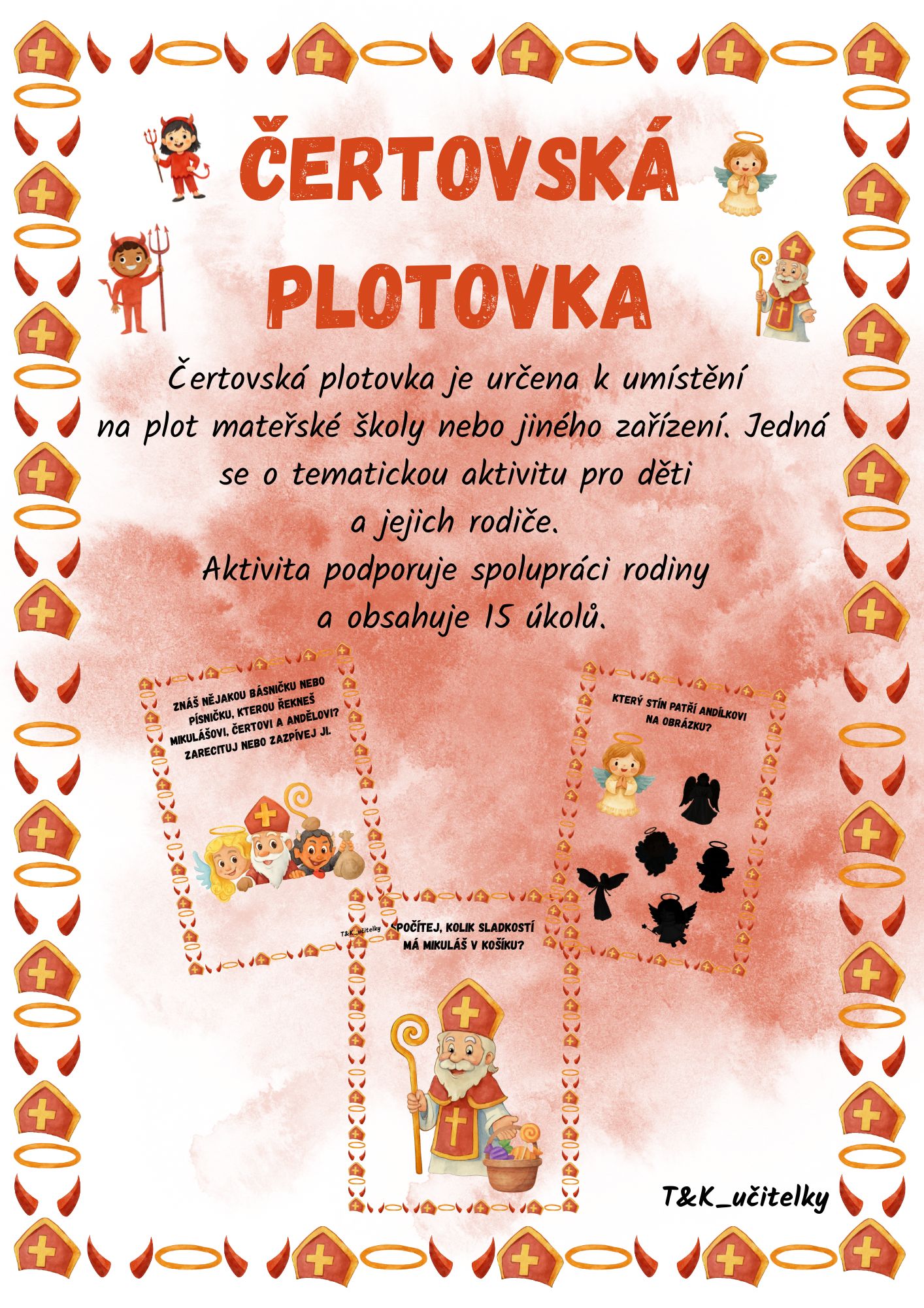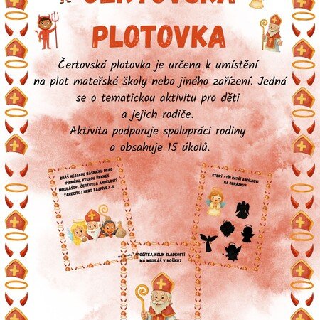 Čertovská plotovka je určena k umístění na plot mateřské školy nebo jiného zařízení. Jedná se o tematickou aktivitu pro děti a jejich rodiče.