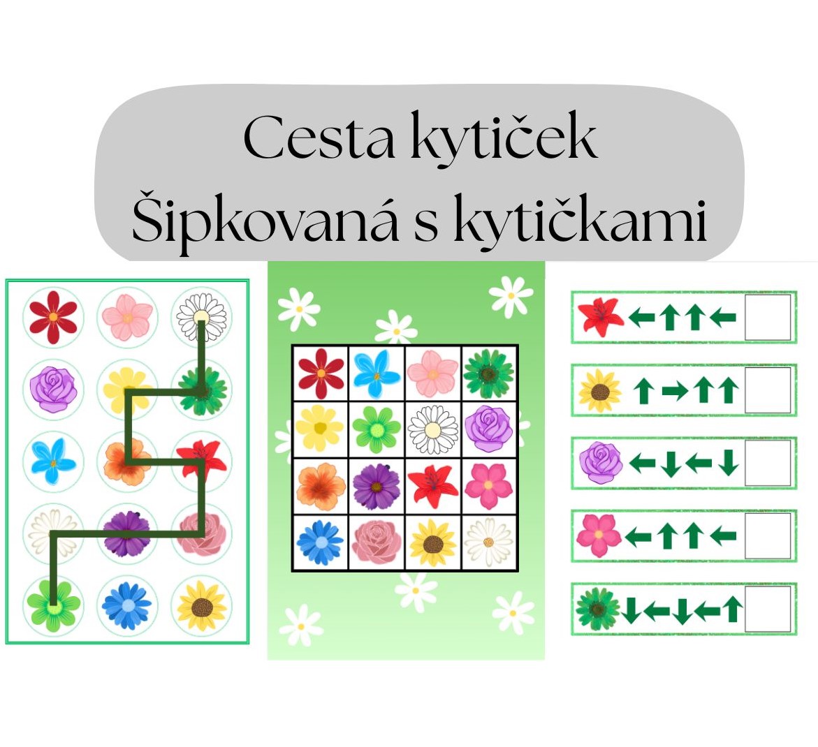 - Šipkovaná s kytičkami - děti najdou cestu pomocí šipek k obrázku (poslední stranu souboru rozstříháme, pak obrázky přikládáme ke kartičkám s šipkami)