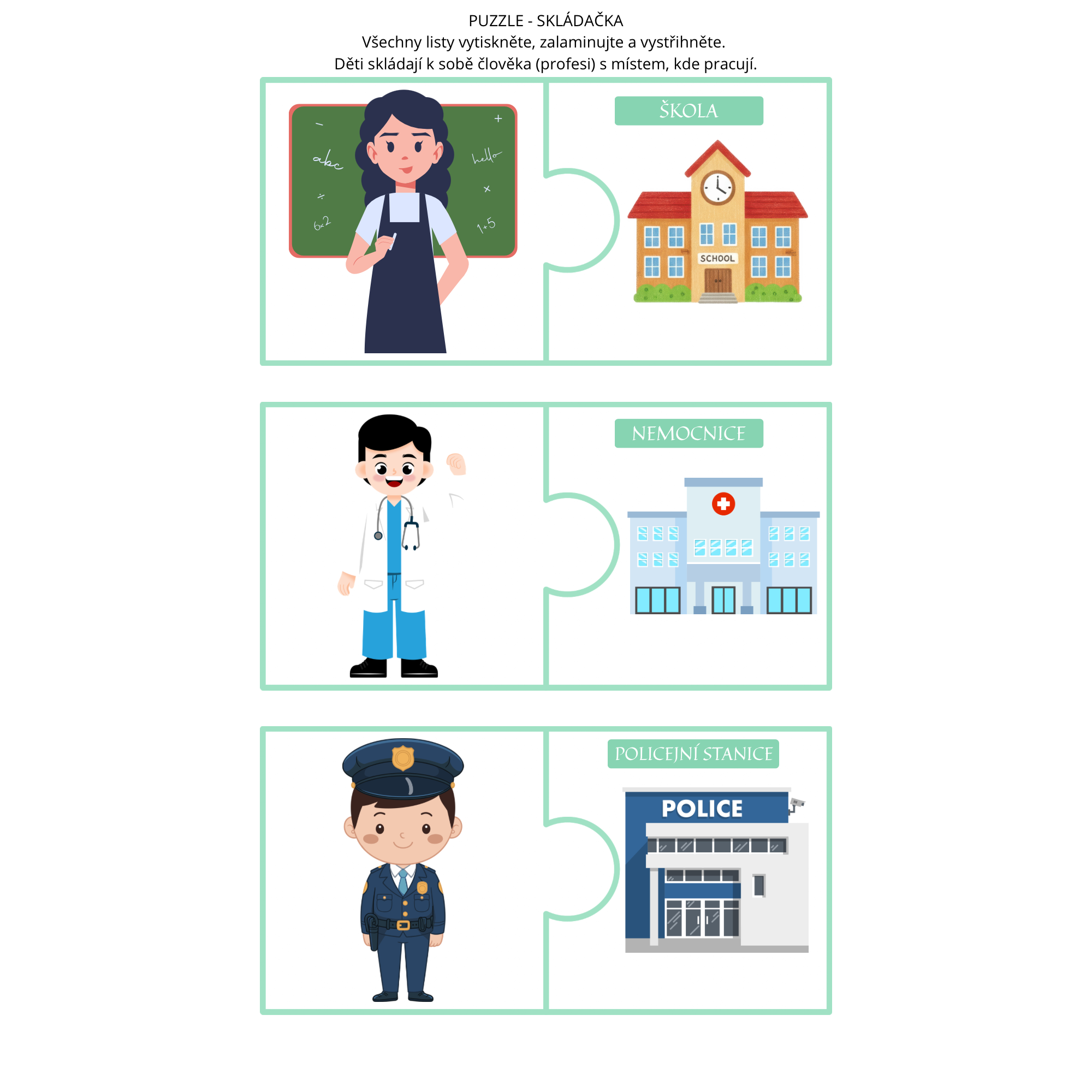 - Logické skládačky: Půlené obrázky (puzzle), kde děti spojují postavu pracovníka s budovou nebo nástrojem (např. policista a policejní stanice).