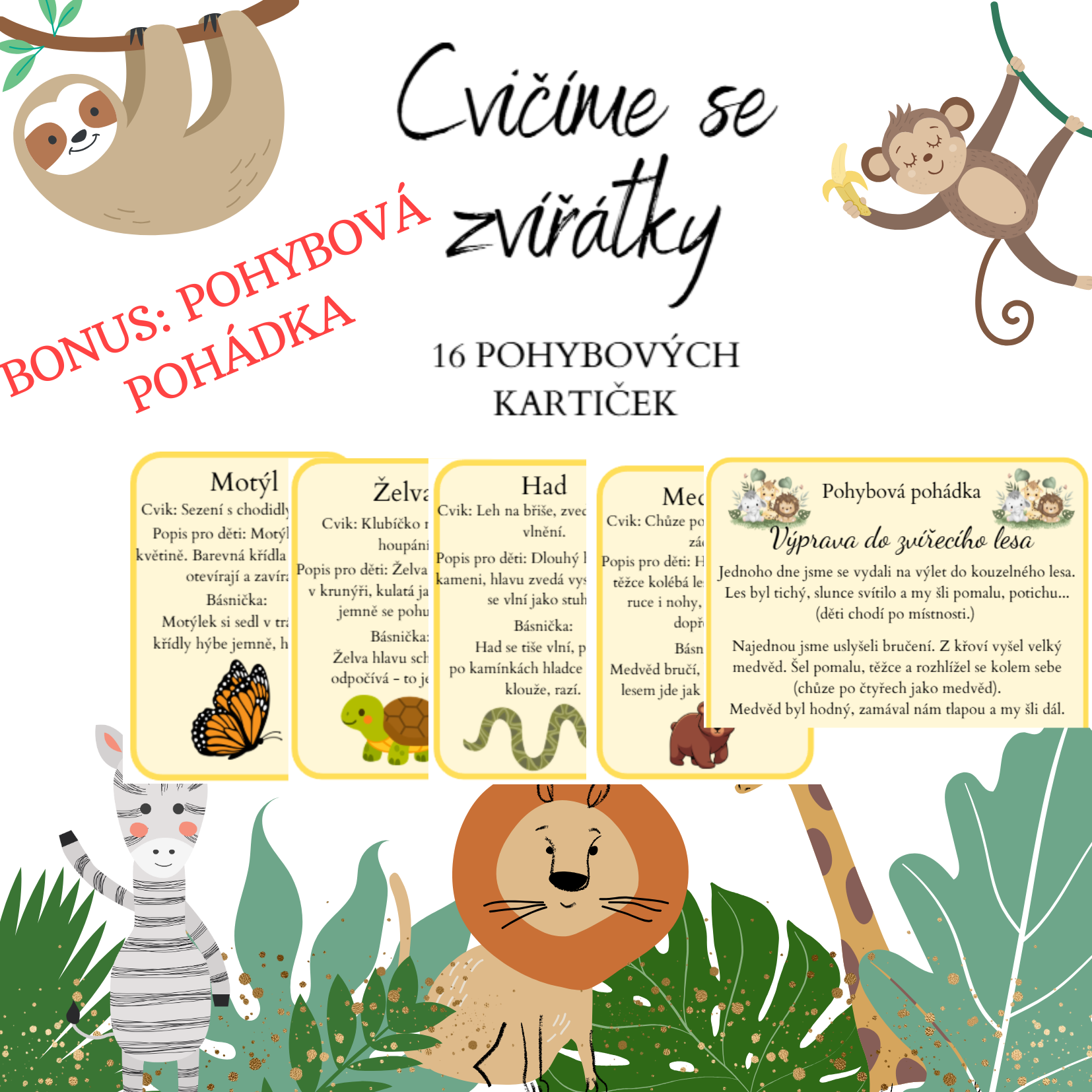 Soubor obsahuje 16 pohybových kartiček Každá kartička obsahuje popis cviku, popis cviku pro děti a také krátkou motivační básničku.