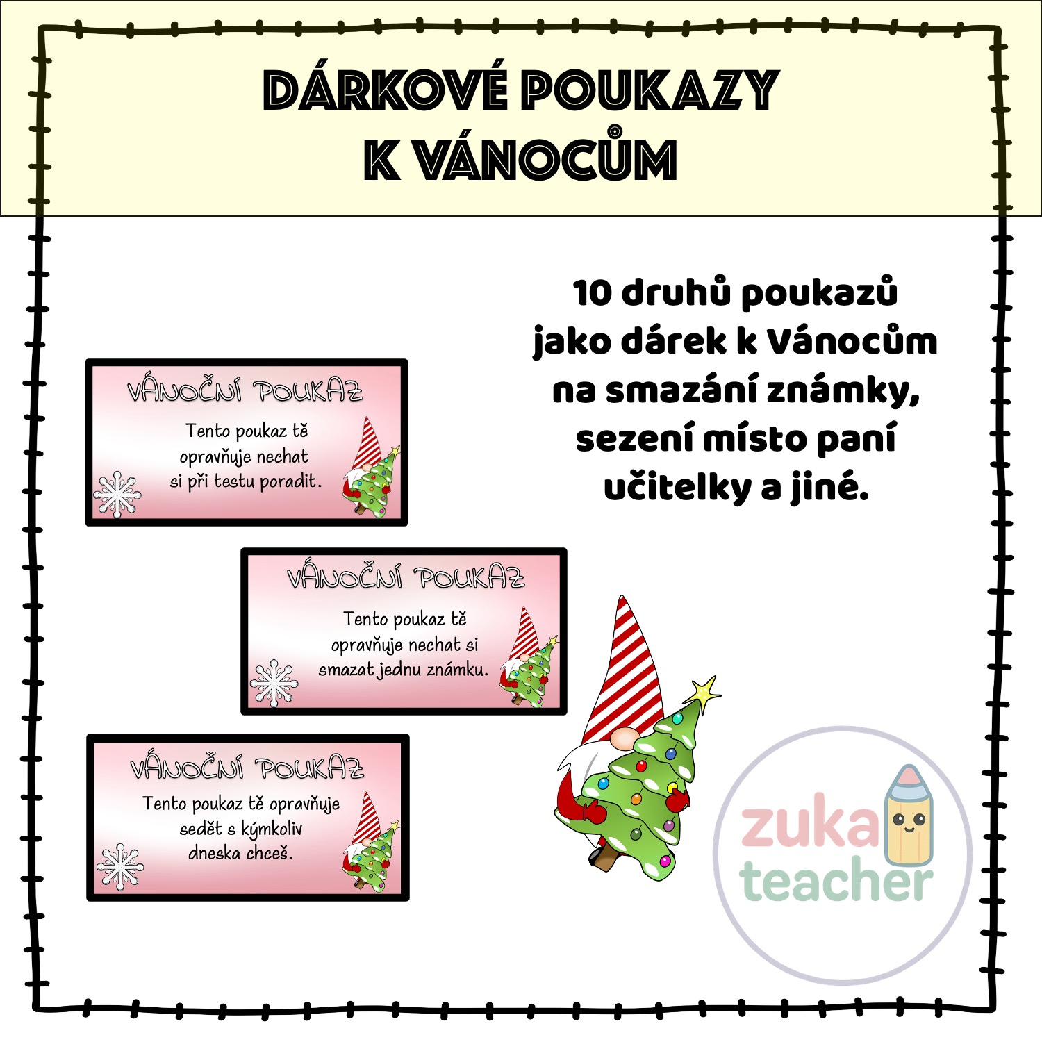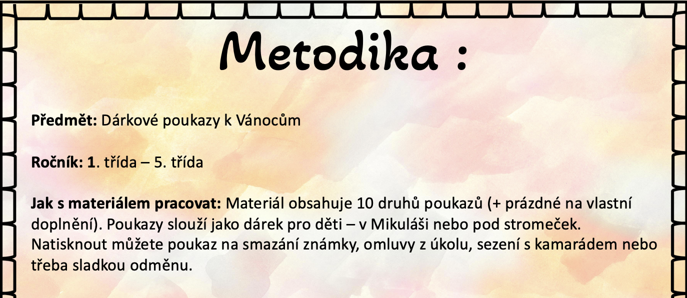 Materiál obsahuje 10 druhů poukazů (+ prázdné na vlastní doplnění). Poukazy slouží jako dárek pro děti – v Mikuláši nebo pod stromeček.