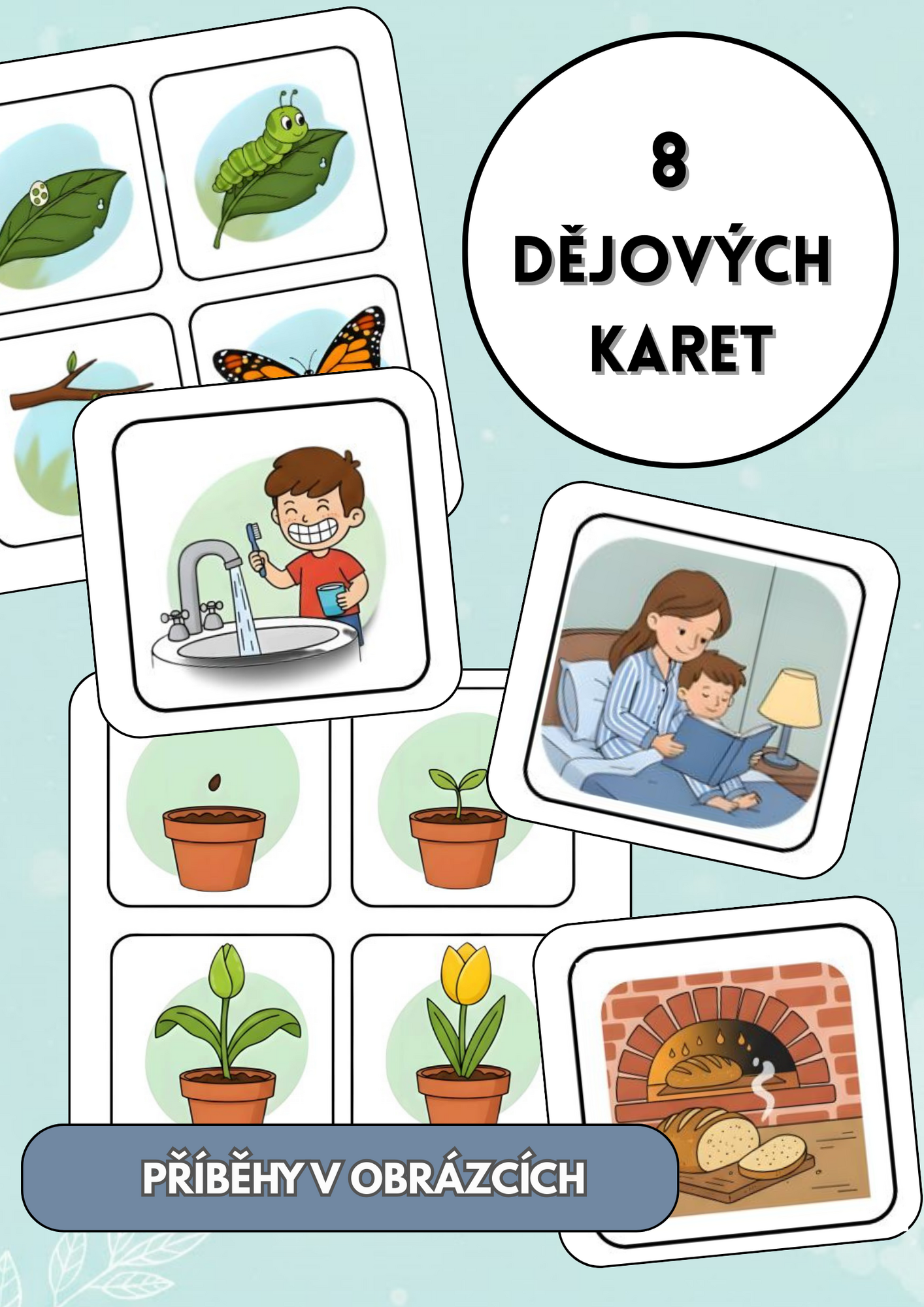 Sada obsahuje celkem 8 tematických příběhů (dějových posloupností), které dětem pomohou pochopit logickou návaznost událostí. Každý příběh je pečlivě ilustrován tak, aby byl pro malé objevitele srozumitelný a motivující.